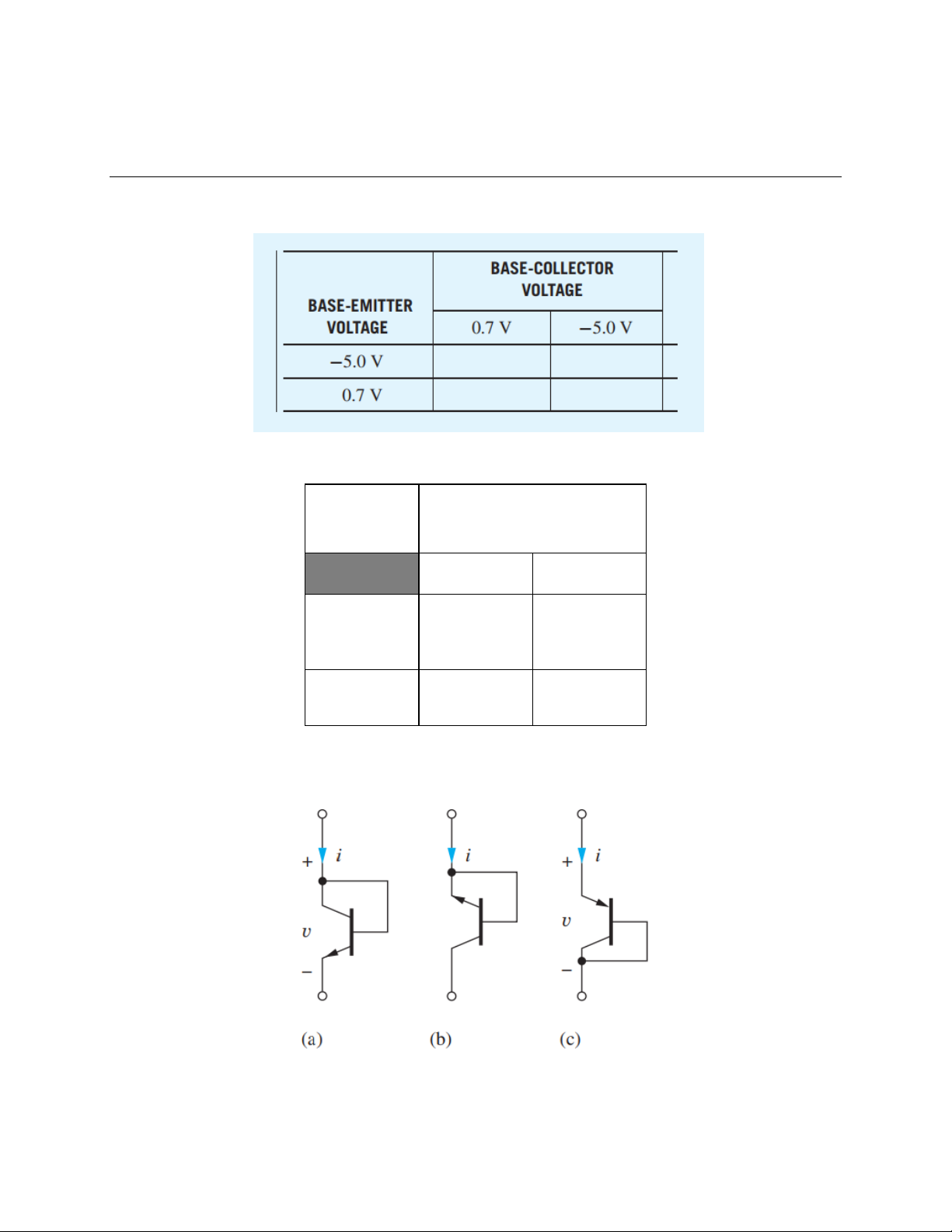 (a) vBE > 0, vBC = 0, tích cực thuận; (b) vBE = 0, vBC > 0, tích cực ngược; (c) vBE > 0, vBC = 0, tích cực thuận.