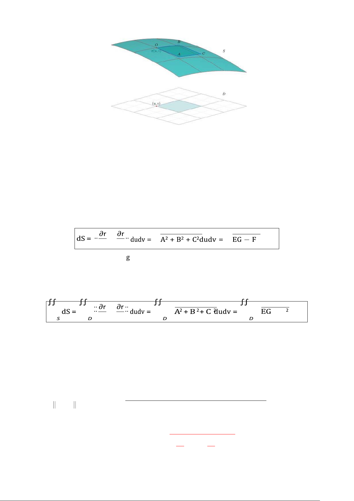 f(x(u, v), y(u, v), z(u, v)) EG − F 2 du dv . D D D D trong đó A (y, z) (z, x) (x, y) = , B = , A = , D(u, v) D(u, v) D(u, v) E = ∂r 2