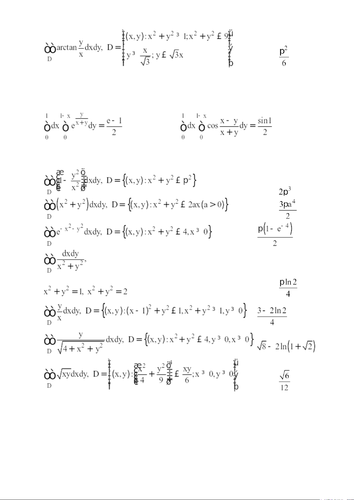 trong đó D là miền nằm trong góc phần tư thứ nhất bị chặn bởi 2 đường tròn . e) ; f) ; g)