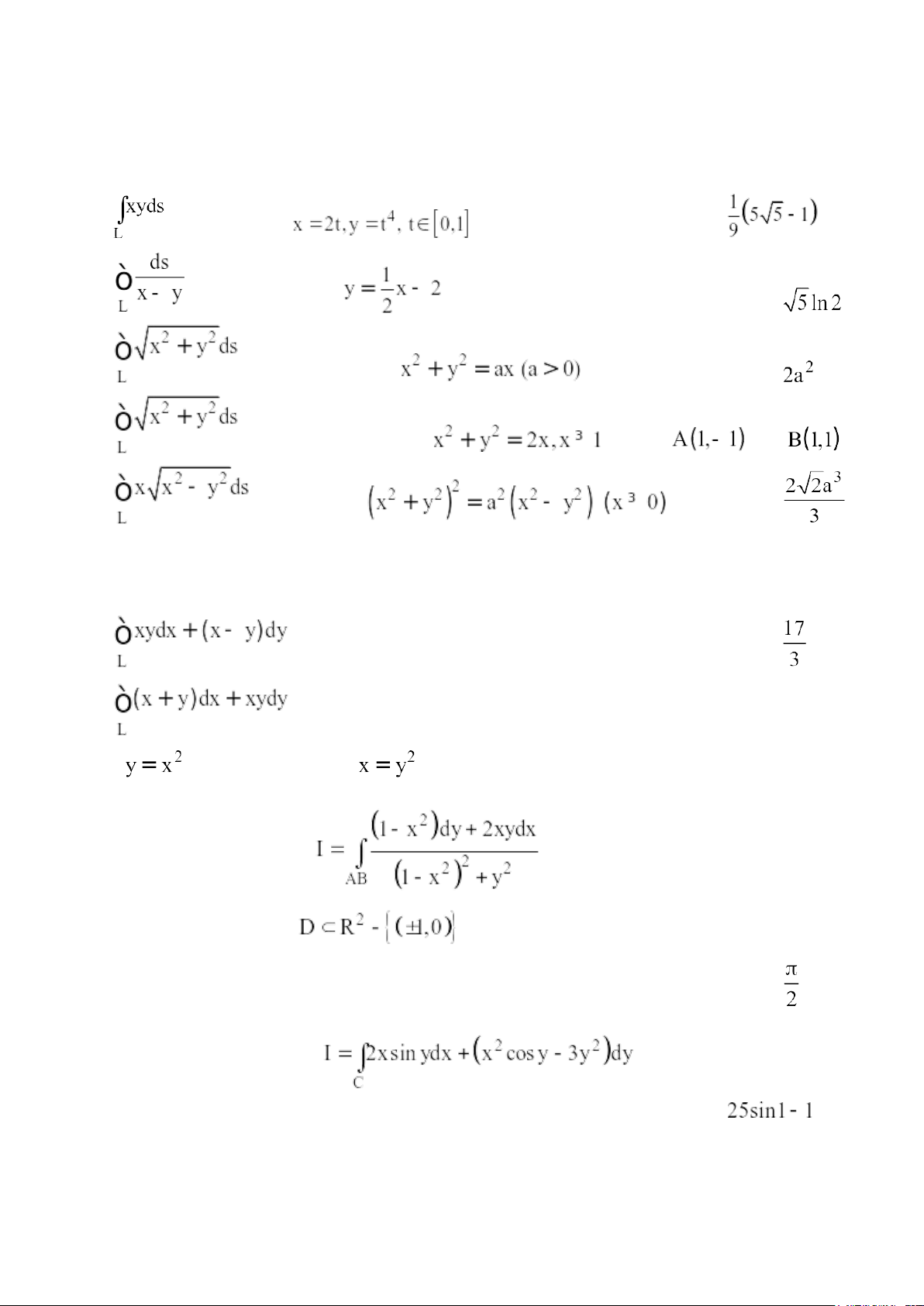 trong đó L là đường tròn lấy theo chiều dương. e) với L là đường cong chạy từ đến O(0,0).