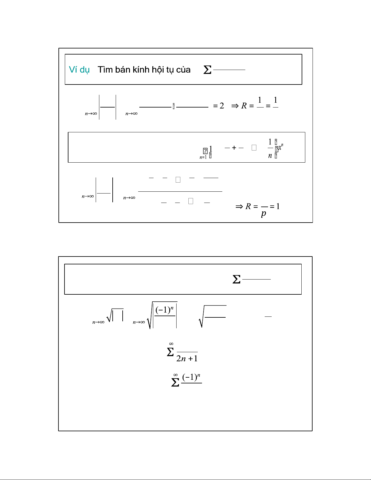 Ví dụ Tìm bán kính hội tụ của Σ + + 1 + + 2 3 1 1 1 1 1+ + + + + p a = lim n+1 = lim 2 3 n n +1 = 1 a 1 1 1 n 1+ + + + 1 2 3 n 31 ∞ (–1)n xn