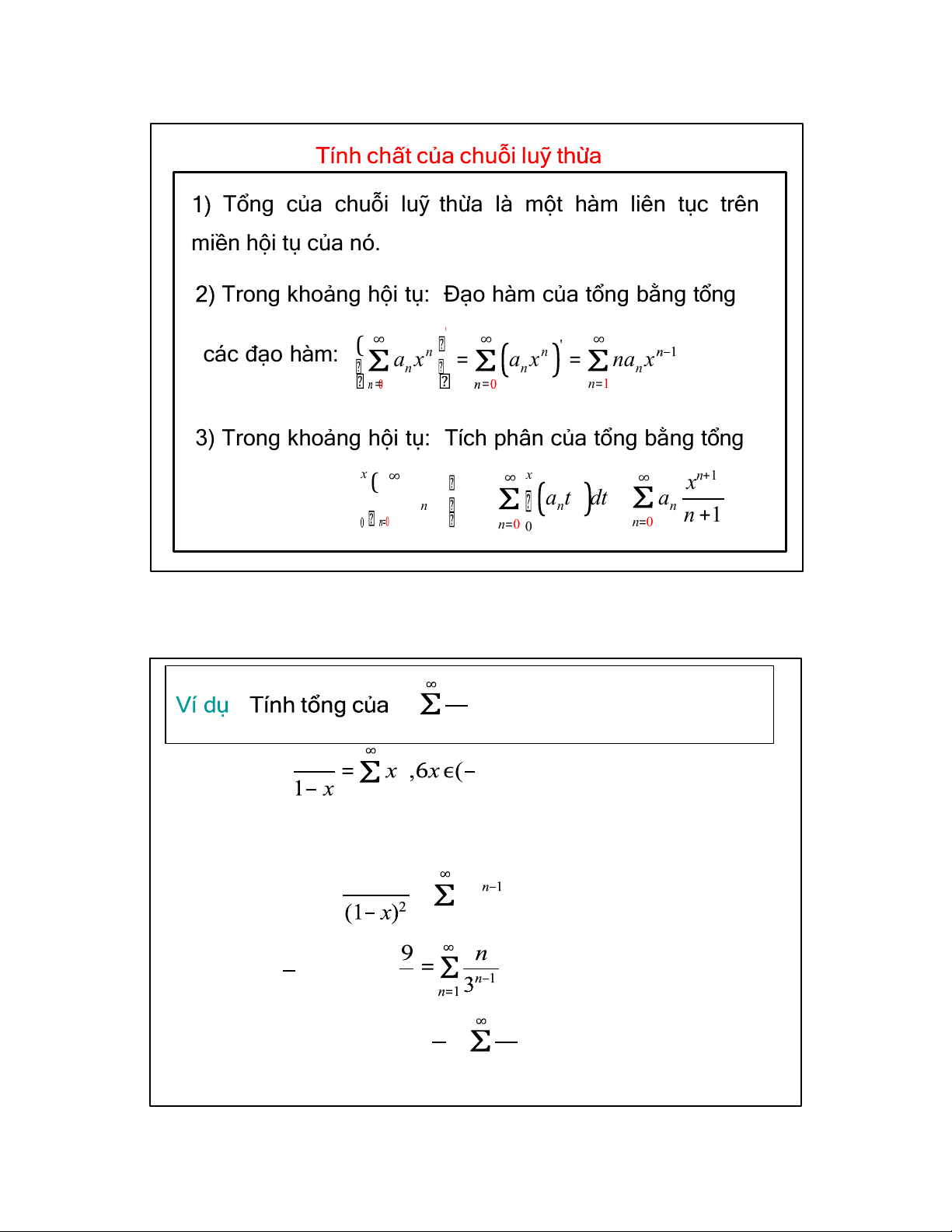 Trong khoảng hội tụ: Đạo hàm của tổng bằng tổng ∞ ∞ các đạo hàm: ( ∞ n n a x a x ' = na x n = n n = = n 1 =