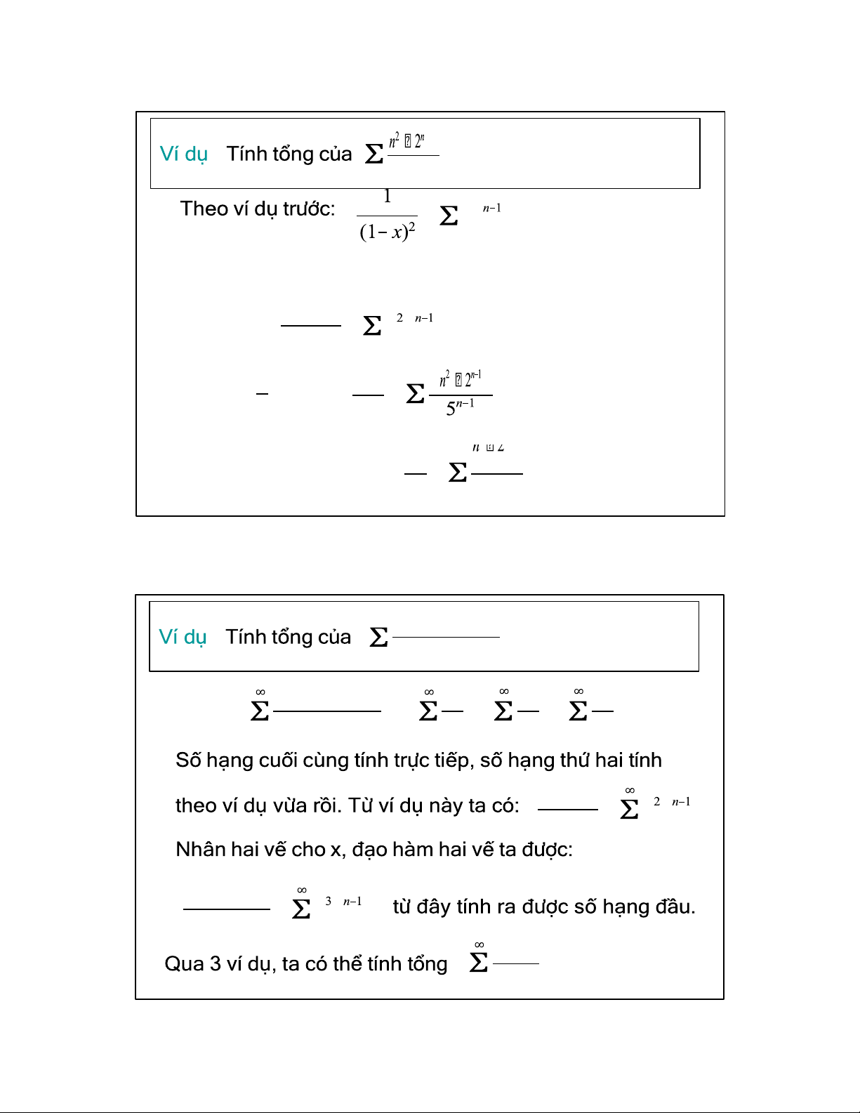 Đạo hàm hai vế (đạo hàm của tổng bằng tổng các đạo hàm) 1 = nx n=1 Cho x = 1 ta có: 3 4 3 Nhân hai vế cho 1/3: = n n 4 n=1 3 38 19 ∞ n+1 n=1 5 ∞ = nx n=1