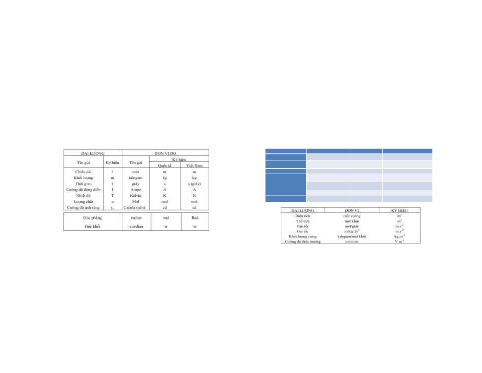 1.1.11. Hệ SI cơ sở Hệ SI mở rộng ĐẠI LƯỢNG ĐƠN VỊ KÝ HIỆU KHÁI NIỆM Lực Niuton (Newton) N kg.m.s-2 Áp suất Patean (Pascal) Pa N,m2 (hay kg.m-1.s-2) Năng lượng Jun (Joule) J kg.m2 .s-2 Công suất Oat (Watt) W J.s-1 (hay kg.m2 .s-3) Điện tích Culong (Coulomb) C A.S Điện thế Von (Volt) V J.C-1 (hay J.A-1 .s-1) Tần số Hec (Hertz) Hz s-1 13 14 7 10/5/2022