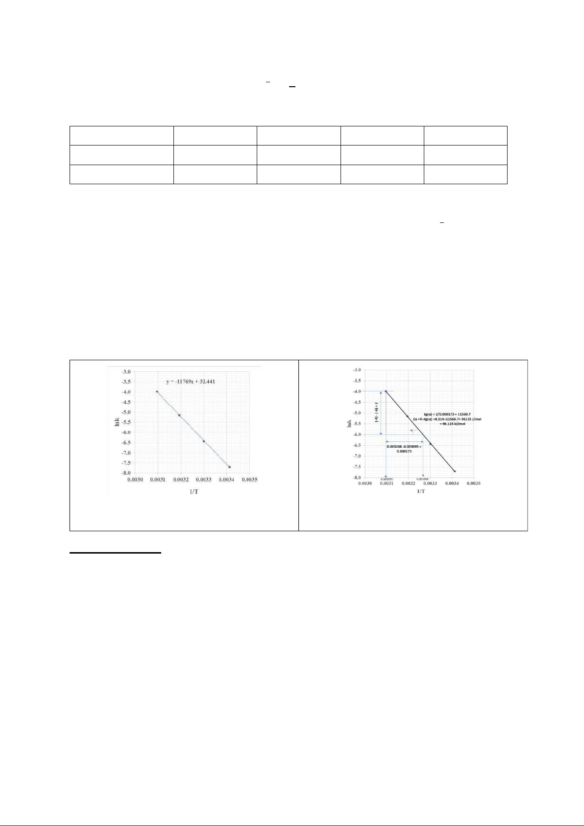 trình Arrhenius: 𝑙𝑛𝑘 = − 𝑎 × + 𝑙𝑛𝐴, biến đổi bảng số liệu thực nghiệm 𝑅 𝑇 nói trên thành: Nhiệt độ (K) 293 303 313 323 1/T 0.00341 0.00330 0.00319 0.00310 lnk -7.7 -6.4 -5.1 -4.0