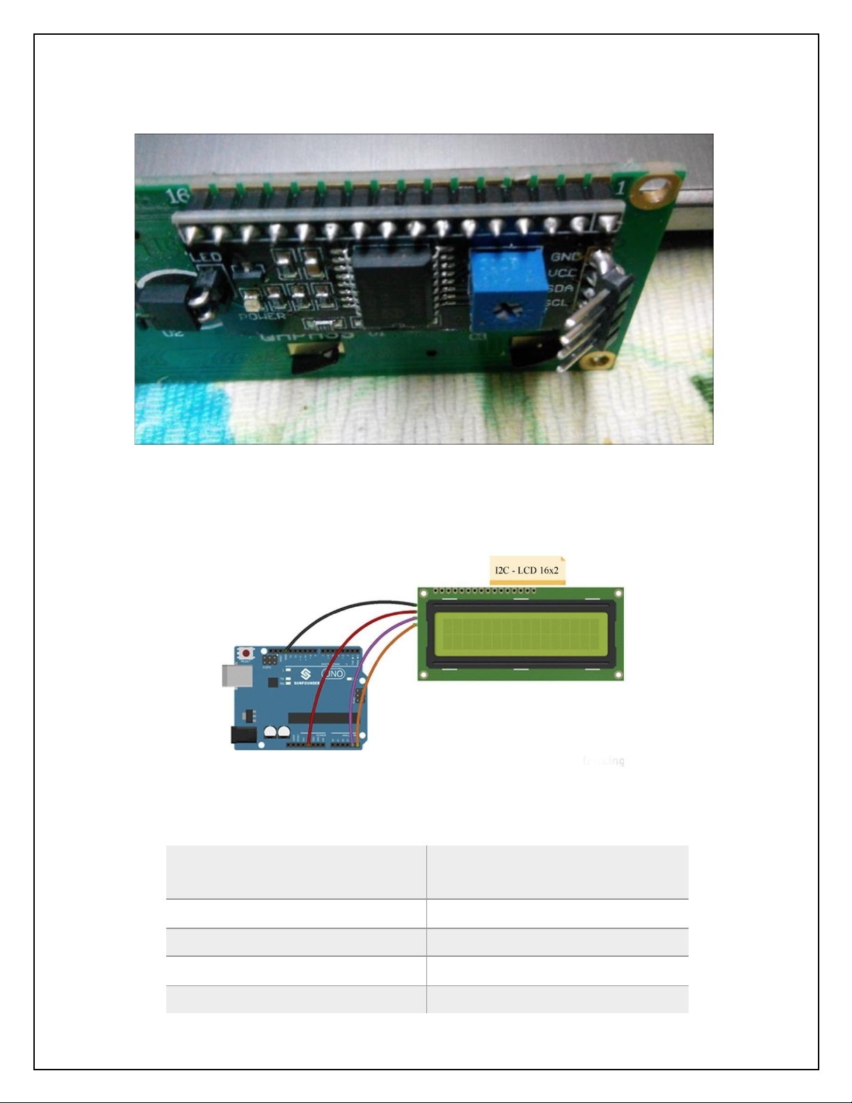 thông qua một module giao tiếp I2C. Module I2C for LCD Arduino (16x2) GND GND Vcc 5V SDA A4 SCL A5