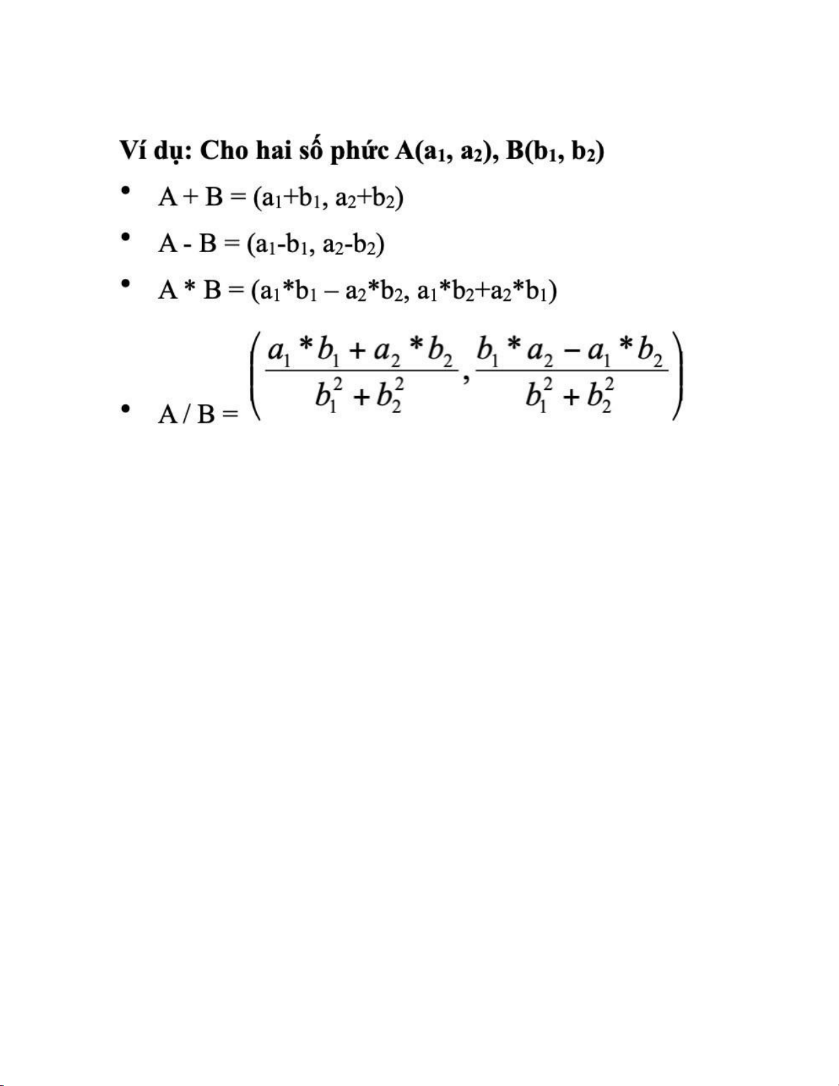 các phép toán +, -, *, /, = =, !=, >, >=, <, <= trên số phức. Định nghĩa phép