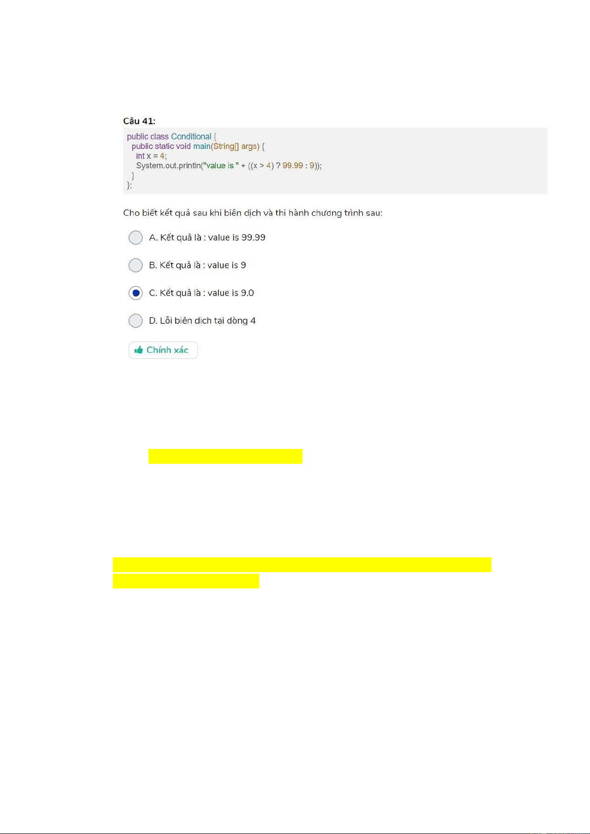 System.out.println(“value is” + ((x>4?99,99 : 9)); } } a. value is 99,99 b. Lỗi biên dịch c. value is 9,0 d. value is 9