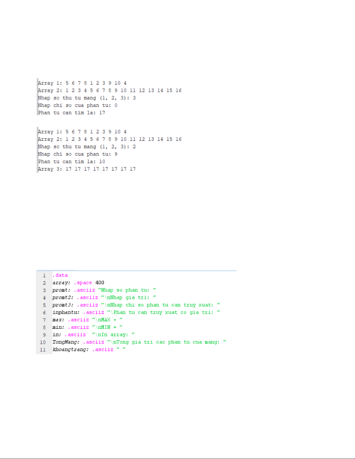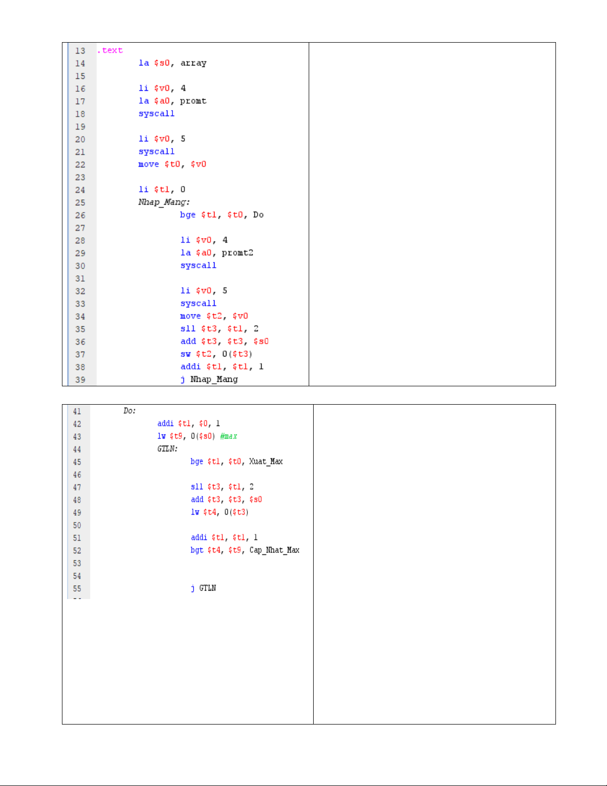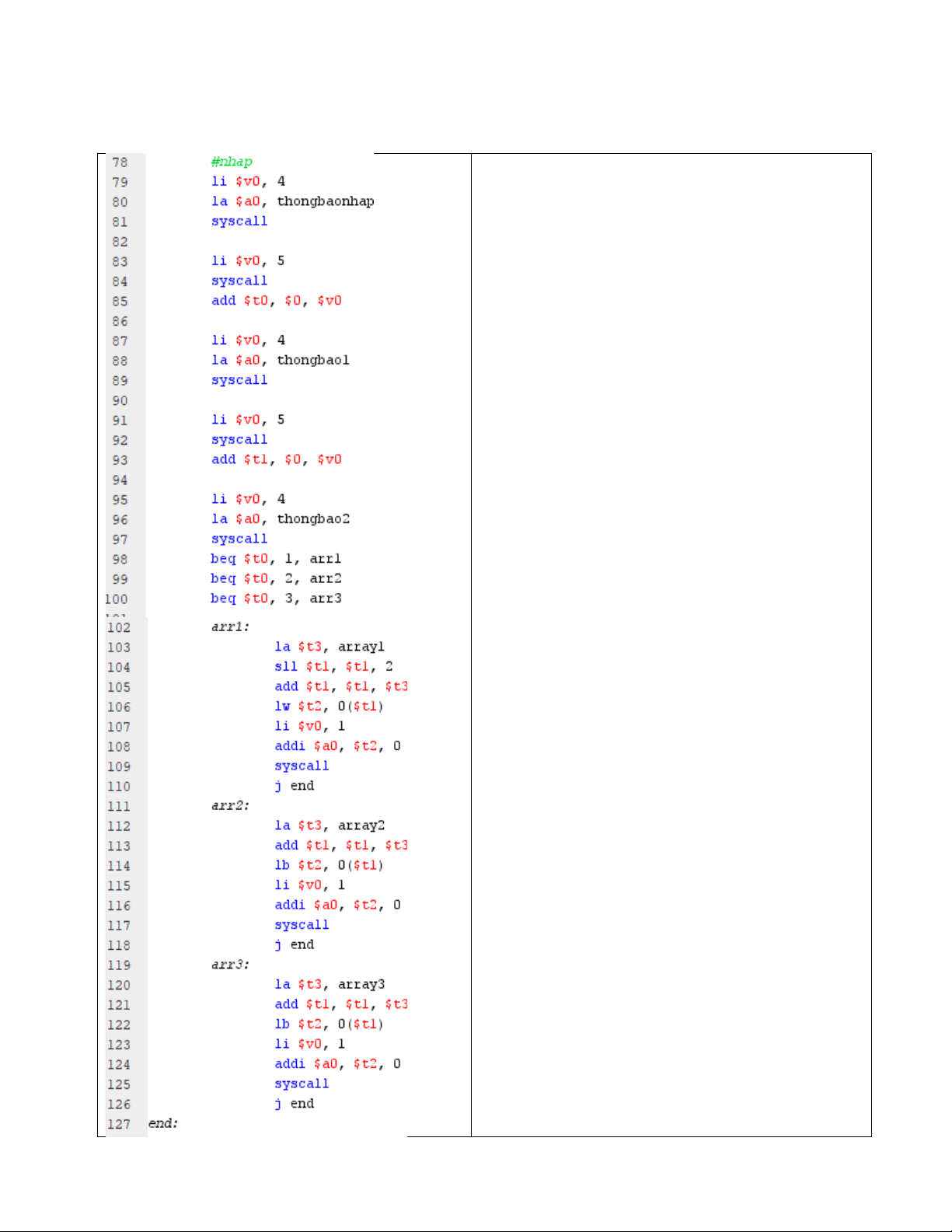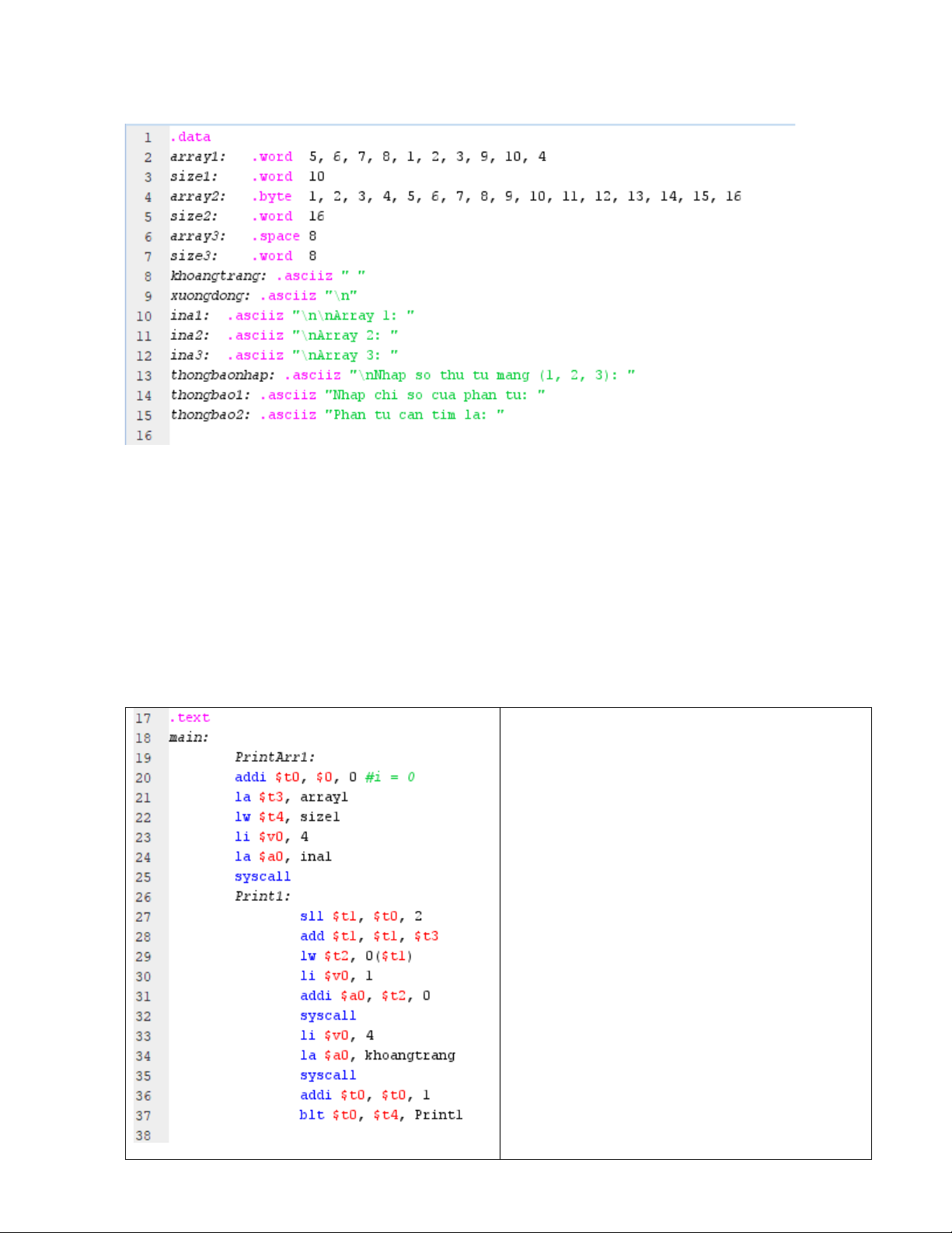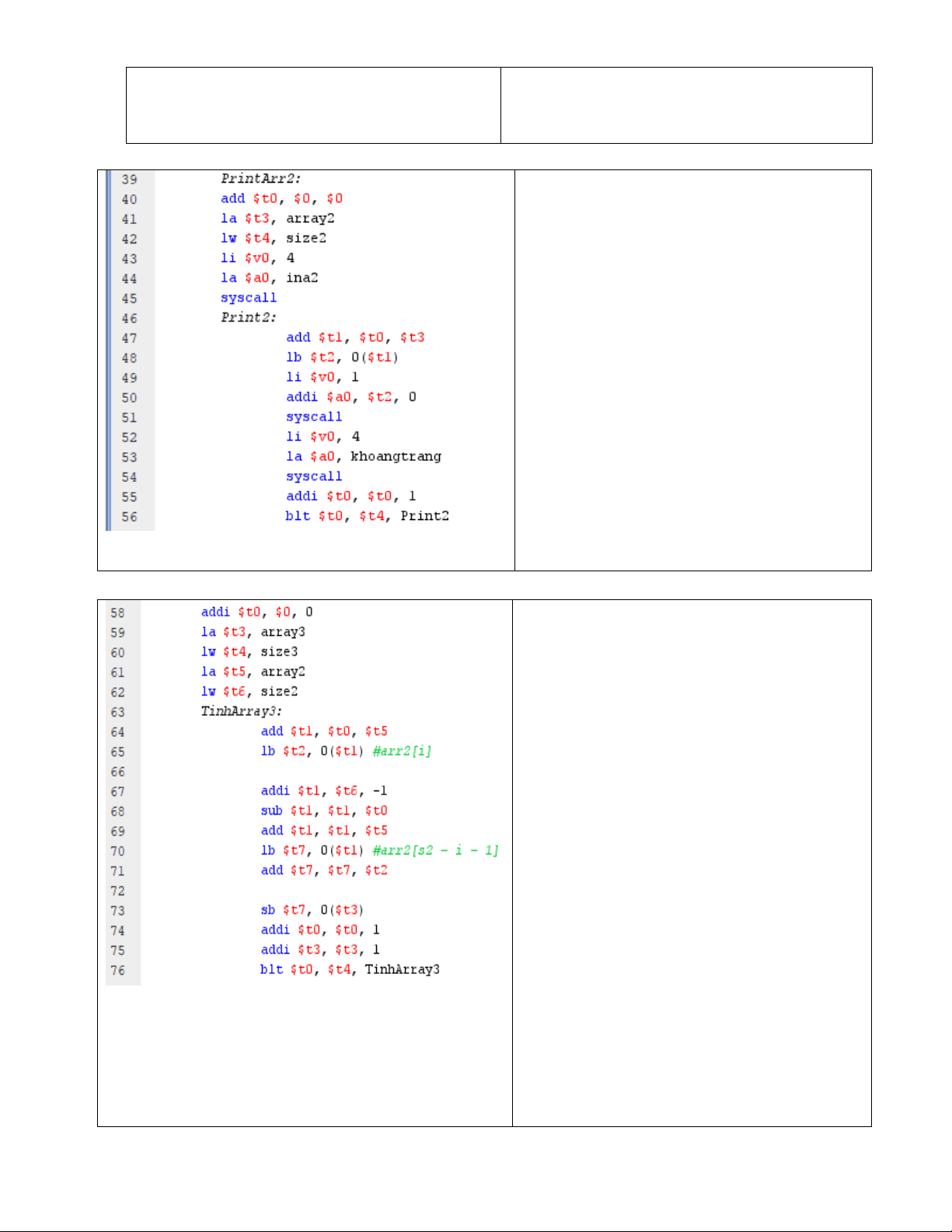 Từ 23 - 25 để thực hiện in chuỗi ina1 ra màn hình ("\n\nArray 1: ") Dòng 27: $t1 = $t0 * 4 Dòng 28: $t1 = $t1 + $t3