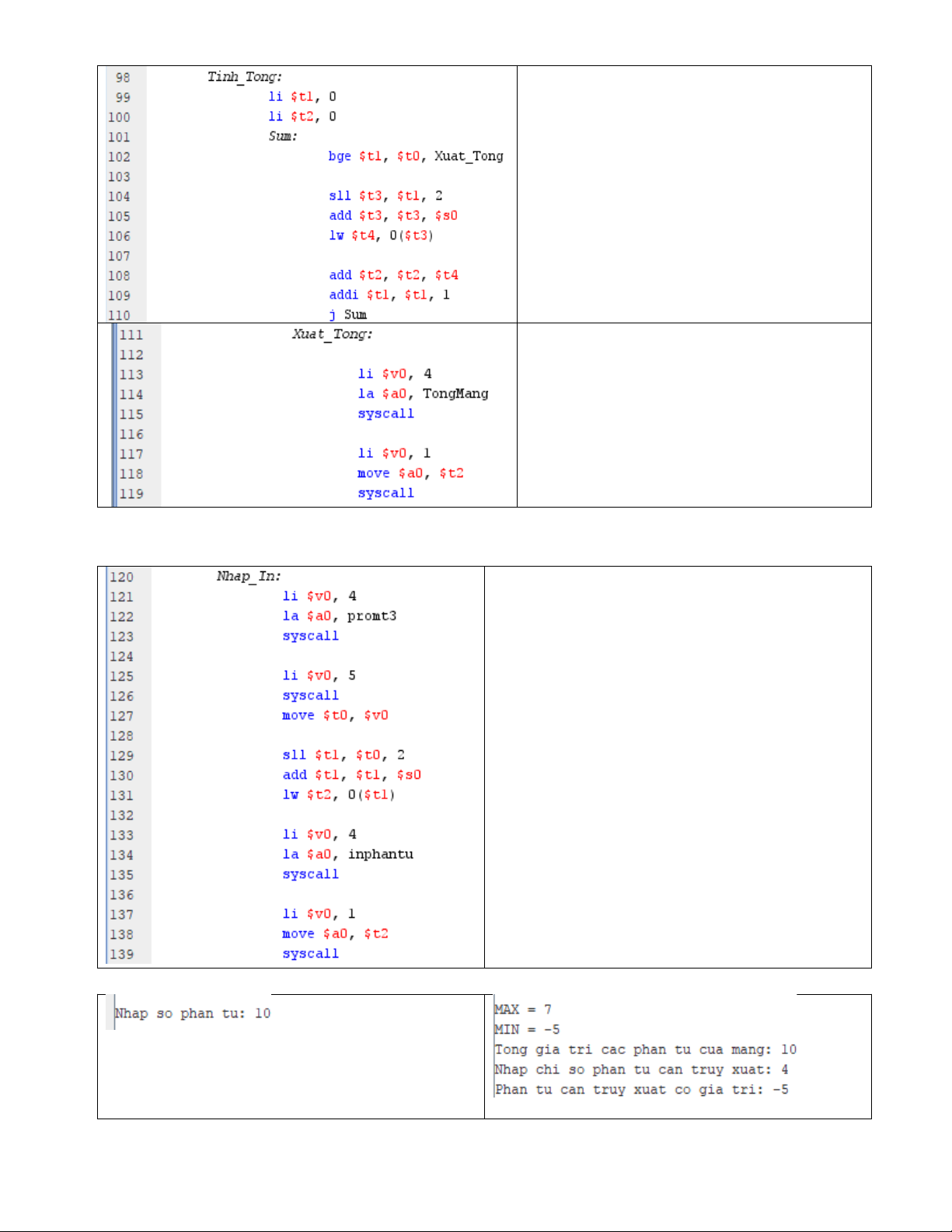 Dòng 104 – 106: lấy giá trị array[i] Dòng 108: $t2 = $t2 + $t4 (sum = sum + array[i])