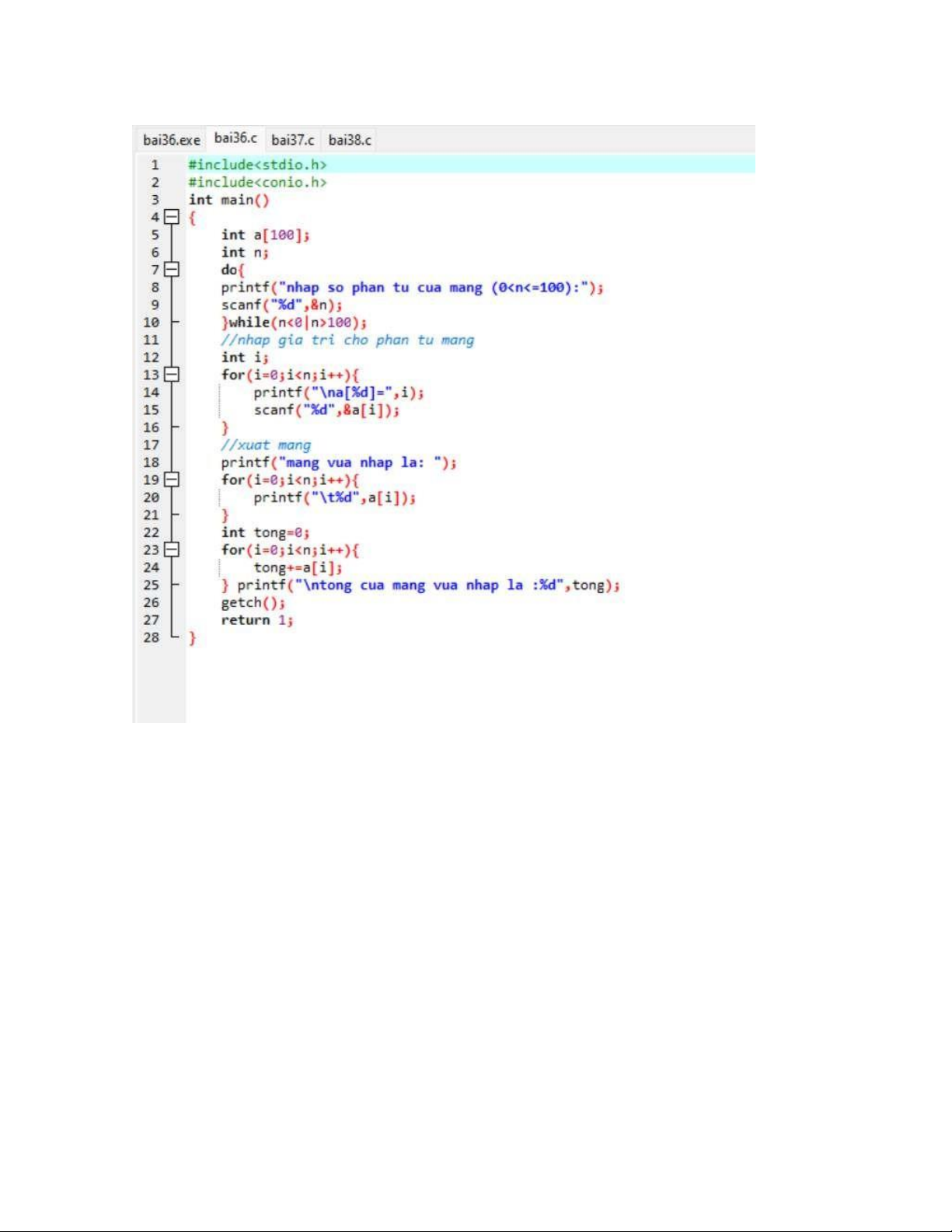 for(i=0;iprintf("\na[%d]=",i); scanf("%d",&a[i]); } //xuat mang printf("mang vua nhap la: "); for(i=0;iprintf("\t%d",a[i]); } int tong=0; for(i=0;i tong+=a[i];