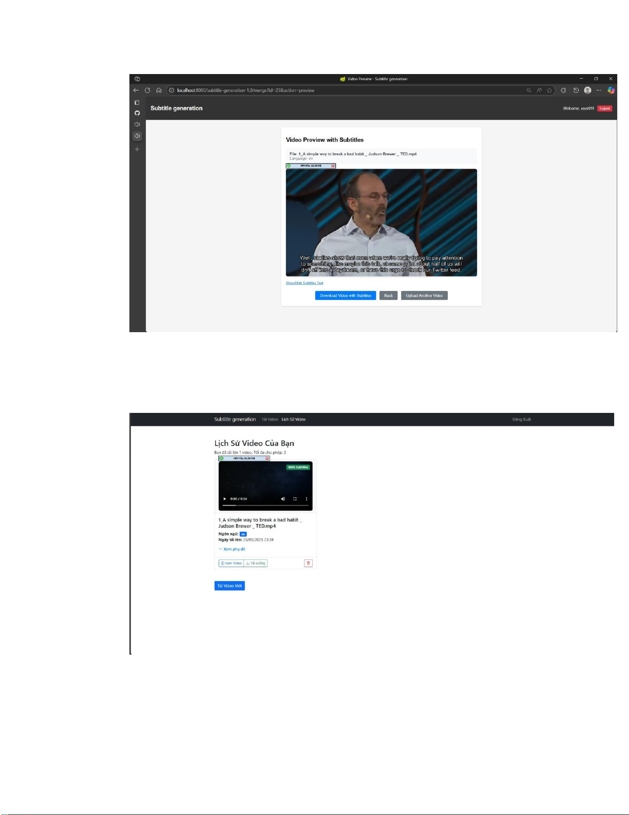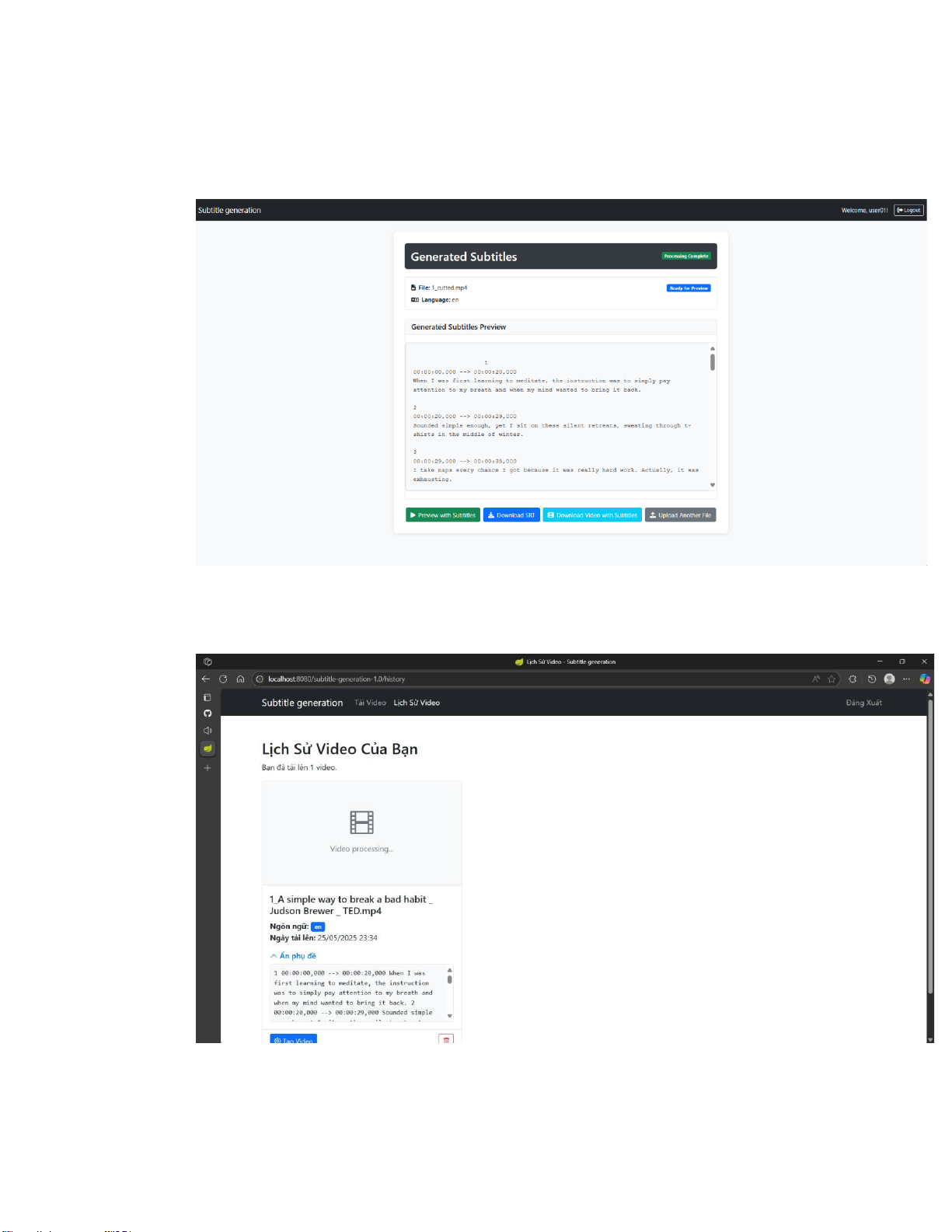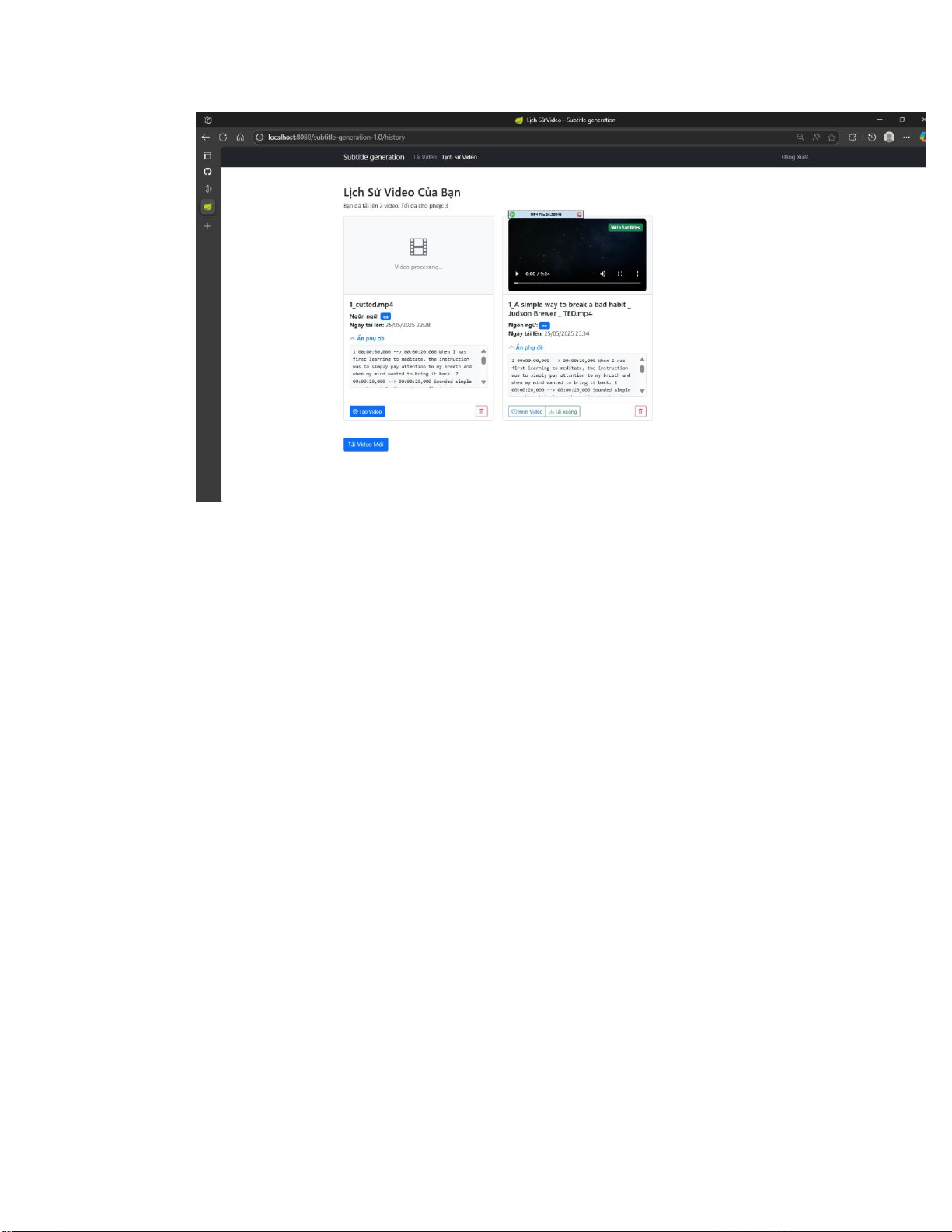 Sau khi xử lý hoàn thành, người dùng có thể xem được phụ đề được trích từ video.