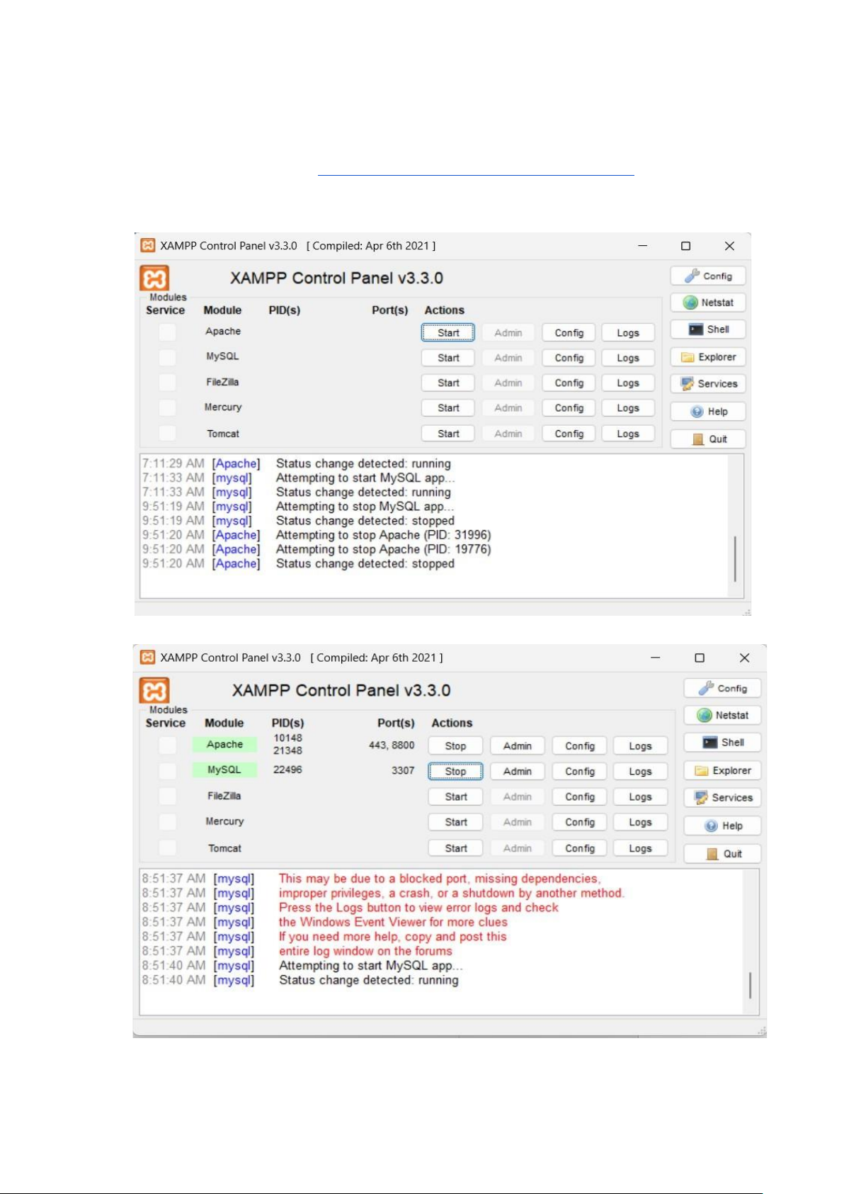 Bước 5: Sau khi khởi động thành công, nhấn “Admin” trên hàng MySQL hoặc truy cập