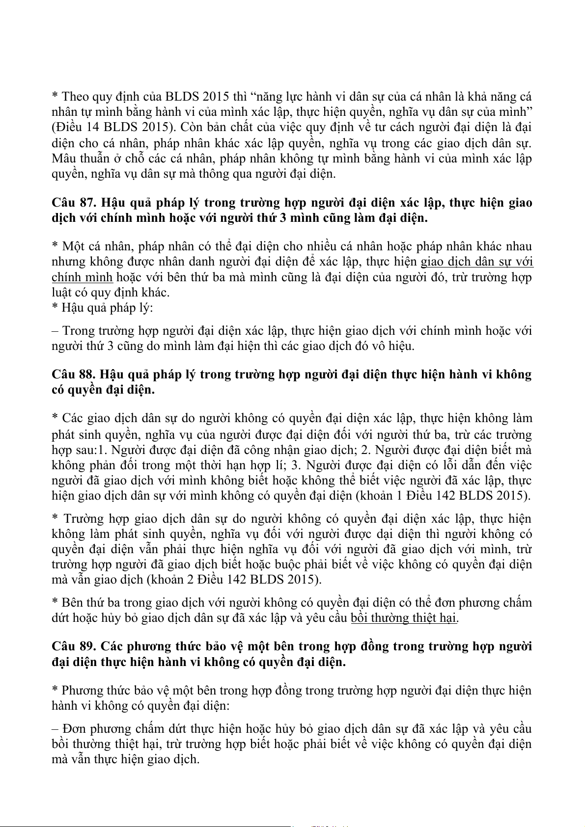 Câu 87. Hậu quả pháp lý trong trường hợp người đại diện xác lập, thực hiện giao
