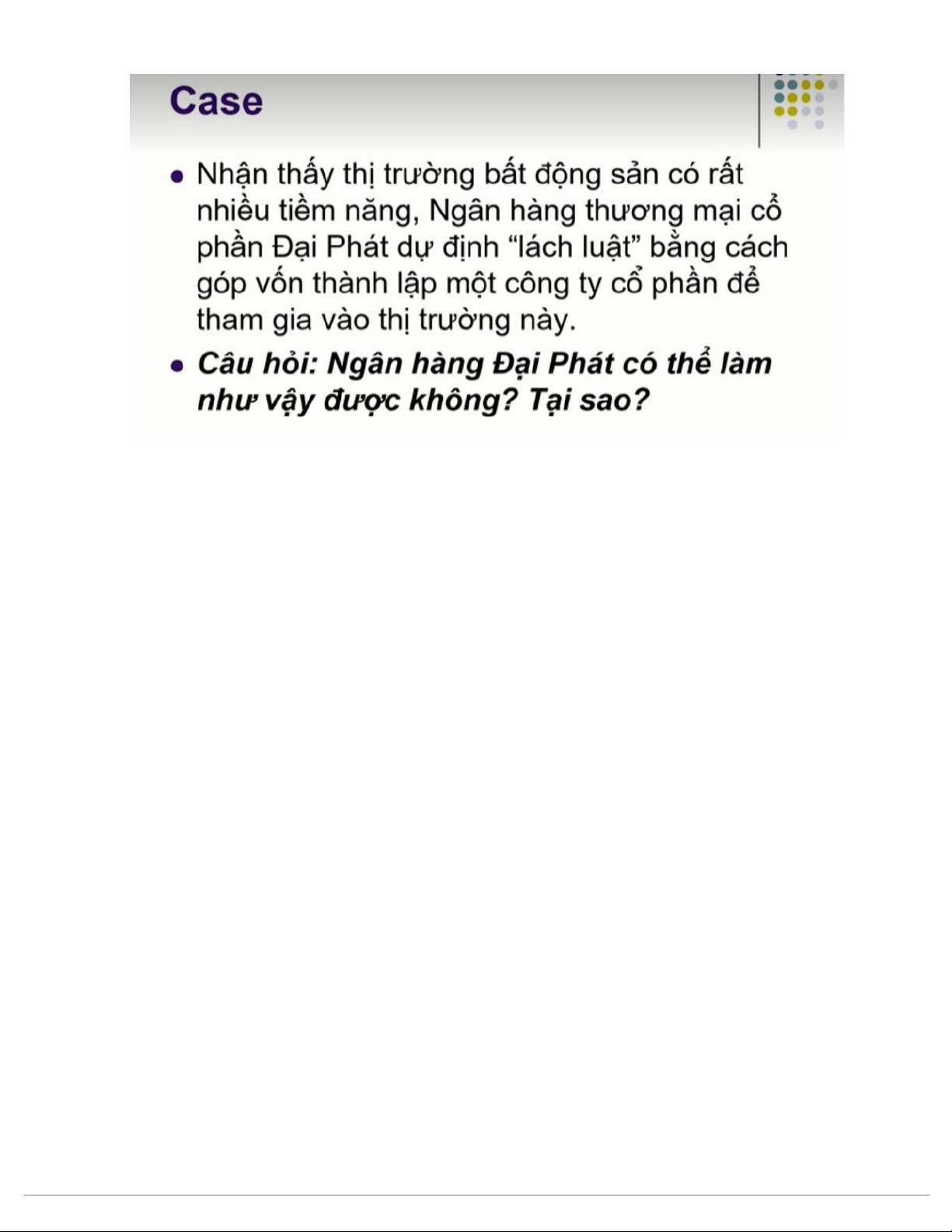 Tất cả các hđ trên đều có quy định của PL hết thậm chí là phải có giấy phép con của NHNN BÀI TẬP: