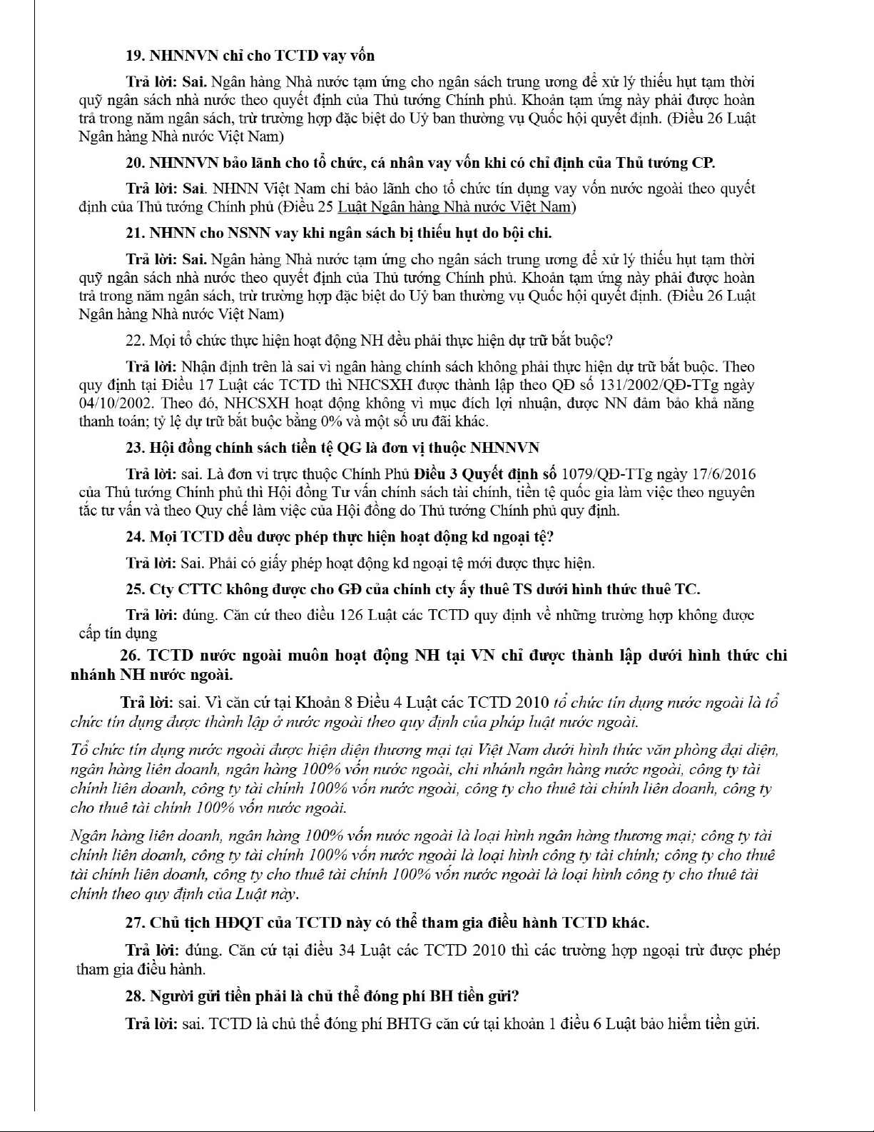 18. Chủ thể cho vay trong quan hệ cấp tín dụng cho vay là mọi tổ chức tín dụng. => Nhận định này sai. Công