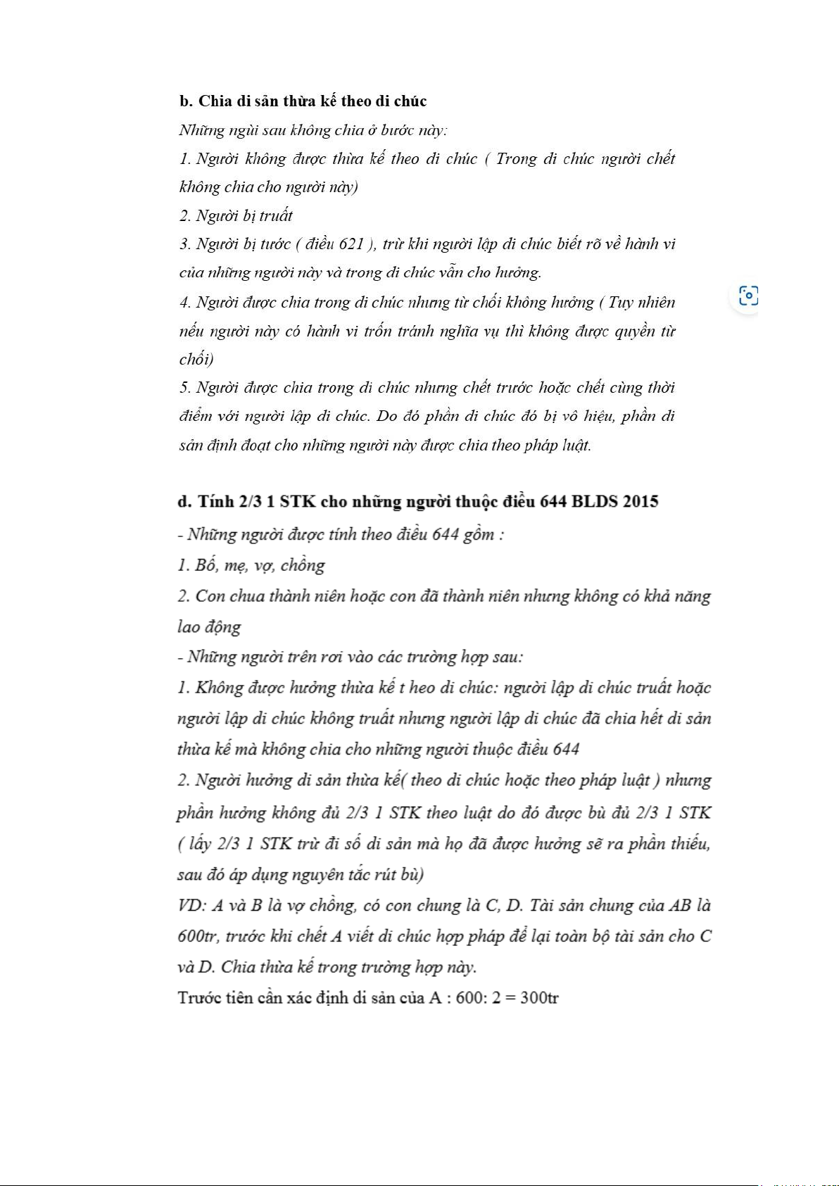 Năm 2015, B lập di chúc để lại cho D 1/3 di sản của bà.
