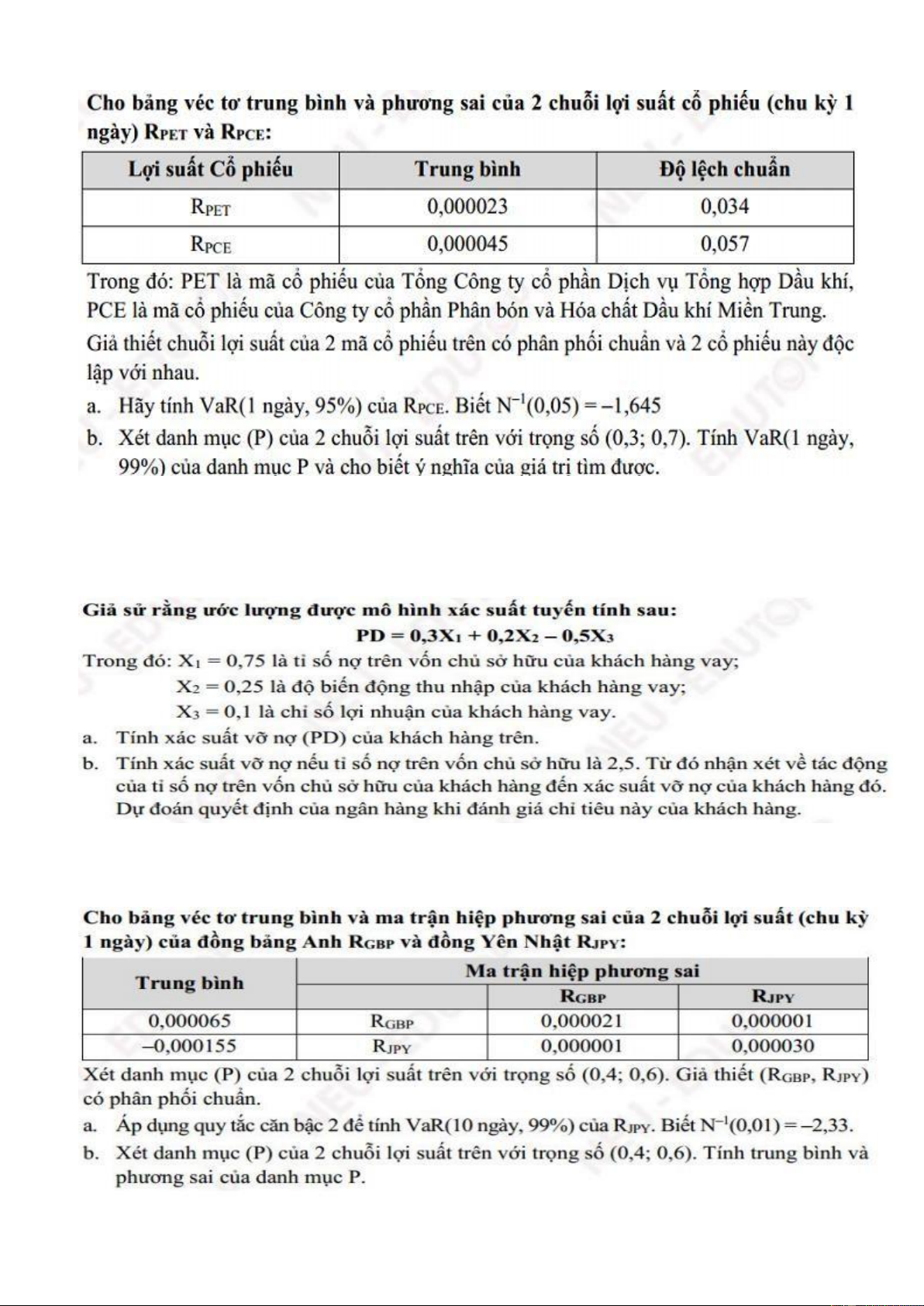 2/ Xác định độ biến động của danh mục biết rằng hệ số tương quan về lãi suất giữa 2 khoản vay là -0.84. Bài 9: 0,00162 c/ Tính VaR(10 ngày, 99%) 5 Bài 10:
