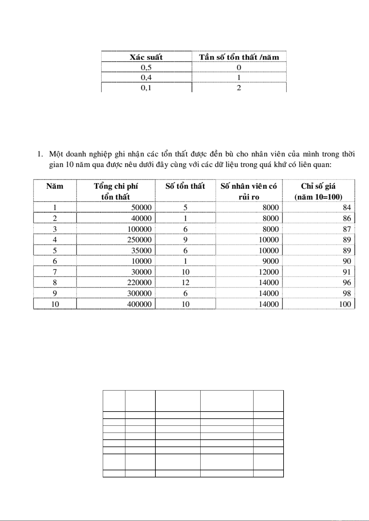 Hãy điều chỉnh số tổn thất theo số nhân viên có rủi ro, chi phí tổn thất theo chỉ số giá. Lập bảng phân