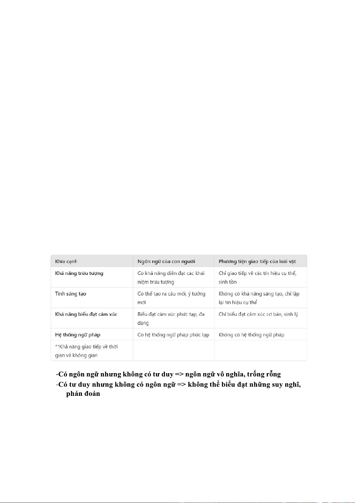 => Các phương tiện giao tiếp của loài vật thiếu đi hầu hết các nét đặc thù của ngôn ngữ.