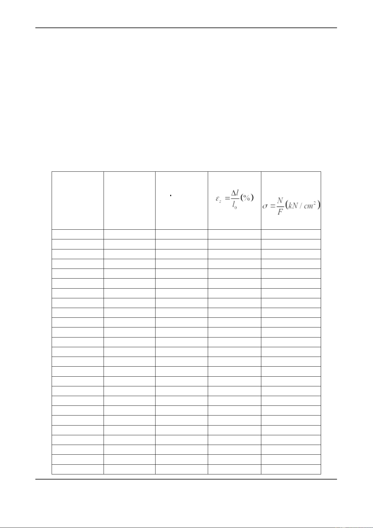 2. Các số liệu thí nghiệm: Chỉ số đồng Cấp tải hồ đo biến trọng dạng l (mm) (kN) dài 10 1,03 0,53 0,0038 4,785 15 1,73 1,23 0,0088 7,177 20 2,39 1,89 0,0135 9,569 25 2,87 2,37 0,0169 11,962 30 3,28 2,78 0,0199 14,354 35 3,78 3,28 0,0234 16,746 40 4,23 3,73 0,0266 19,139 43 4,6 4,1 0,0293 20,574