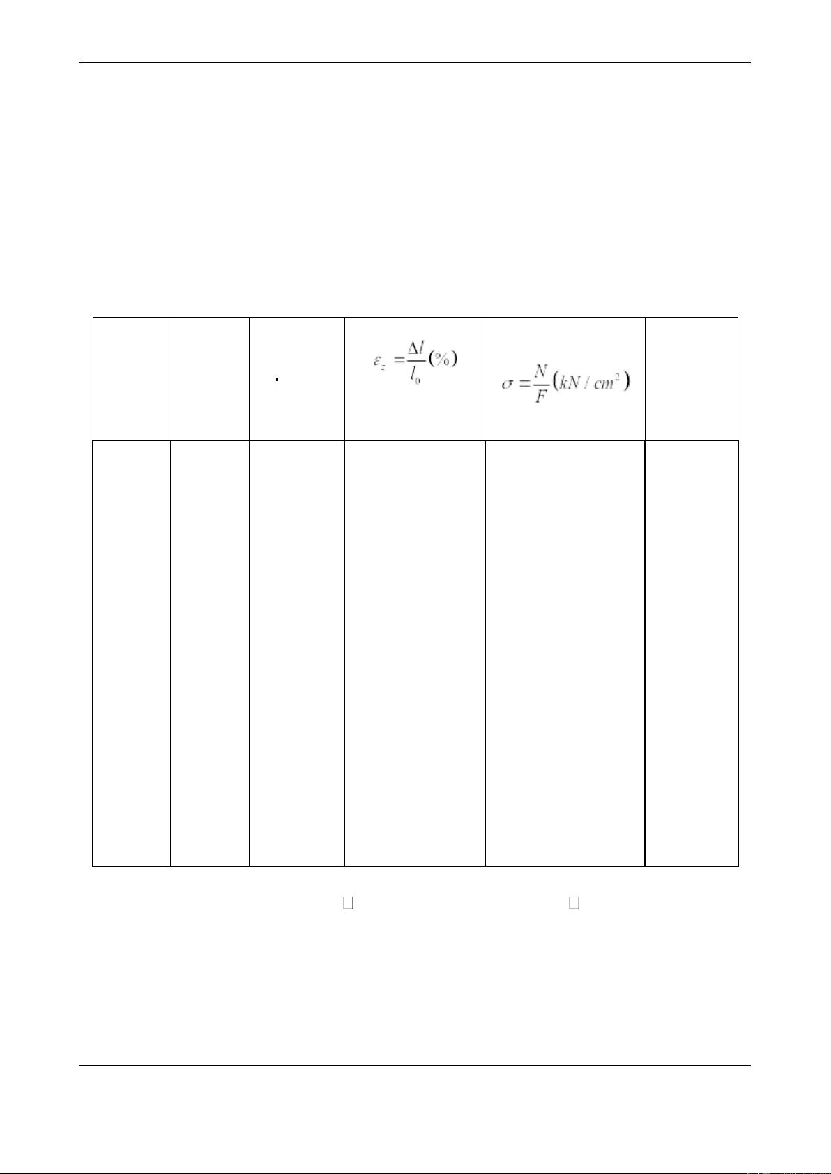 4. Số liệu và kết quả thí nghiệm: K í Cường thước mẫu (mm) Diện c Lực nén độ chịu Số TT h tích giới hạn nén giới mẫu chịu Dà Rộn Ngh hạn Cao nén F i g (kN) Rn (cm2) (kN/cm2) a b h 1 50 30 30 9 27,57 3,063 2 50 30 30 9 42,34 4,704 3 50 30 30 9 39,92 4,436 R tb = 4,068 n