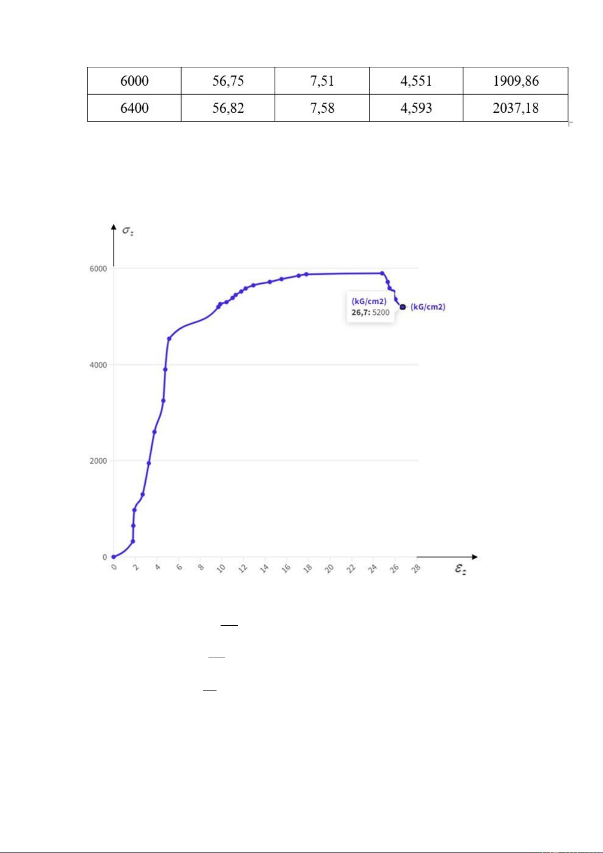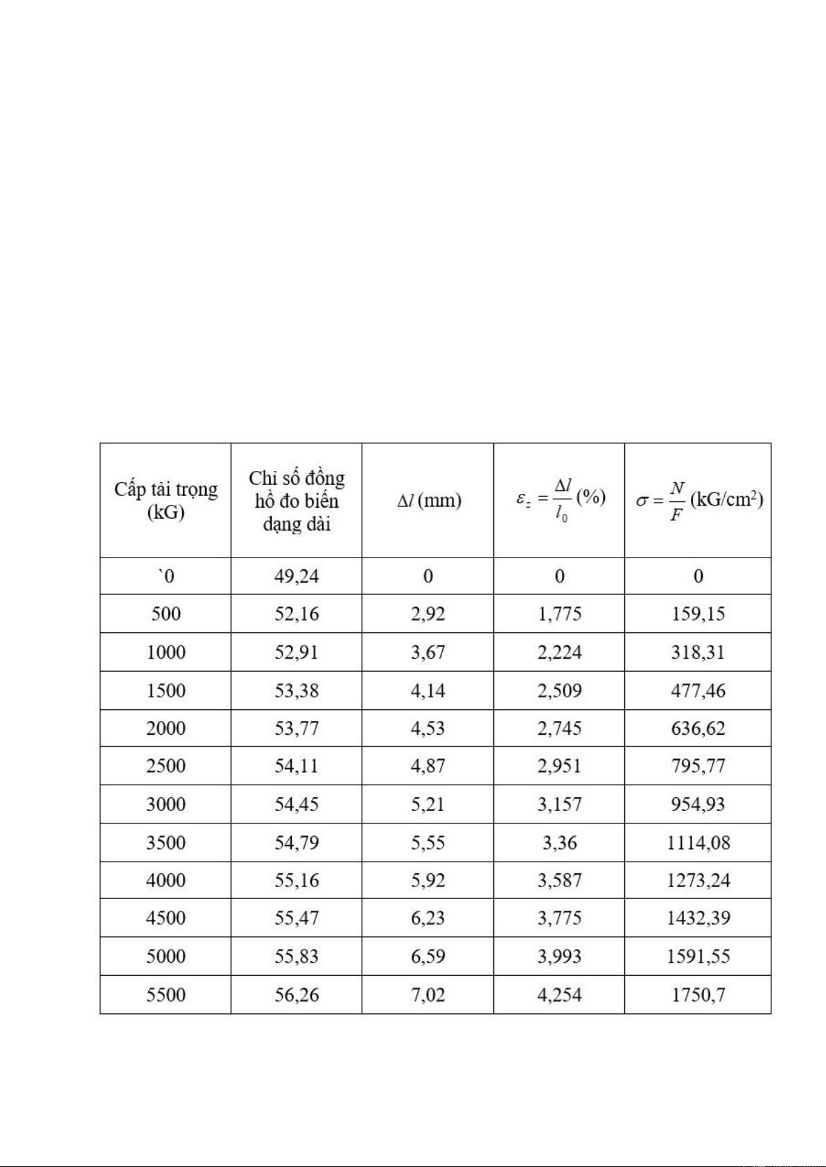 2. Các số liệu thí nghiệm: Chỉ số Đường Cấp tải đồng l N hồ đo kính mẫu l (mm) ε = (%) σ = trọng (kG) biến dạng z l khi phá (kG/cm2) dài 0 hoại F 0 31,18 0 0 0 500 31,2 0,02 0,09 324,8 1000 31,23 0,05 0,227 649,6 2000 31,31 0,31 0,59 1299,2 3500 31,42 0,24 1,09 2273,6 4000 31,46 0,28 1,27 2598,4 4500 31,51 0,33 1,5 2923,2 5000 31,56 0,38 1,72 3248 5500 31,63 0,45 2,045 3572,9 6000 31,7 0,52 2,36 3897,7 6500 31,79 0,61 2,772 4222,5 7000 31,89 0,71 3,227 4547,3 7500 32,02 0,84 3,81 4872,1 8000 32,17 0,99 4,5 5196,9 8500 32,33 1,15 5,227 5521,7 9000 33,54 1,36 6,18 5846,5 9200 32,67 1,49 6,772 5976,4 9500 32,87 1,69 7,681 6171,3 9600 32,98 1,8 8,18 6235,3 9800 33,14 1,96 8,9 6366,2 9900 33,22 2,04 9,27 6431,2 10000 33,36 2,18 9,9 6496,1 10100 33,47 2,29 10.4 656,1 10200 33,59 2,41 10,954 6626 10300 33,75 2,57 11,681 6691 10400 33,96 2,78 12,63 6755,9 10450 34,18 3 13,62 6788,4 10500 34,58 3,4 15,45 6820,9 10