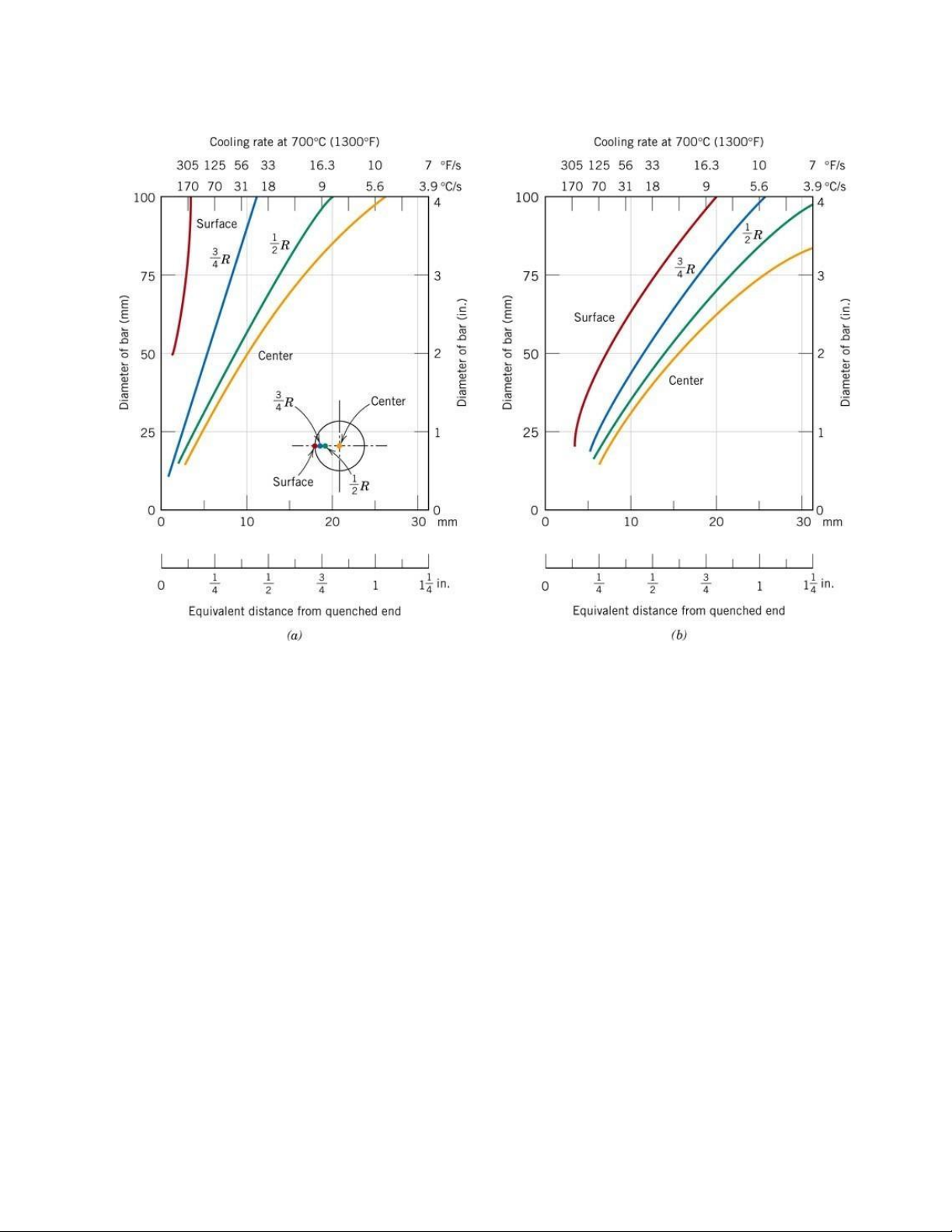 Hình 11. Tốc độ làm nguội là hàm số của bán kính mẫu đem tôi a) tôi trong nước, b) tôi trong dầu
