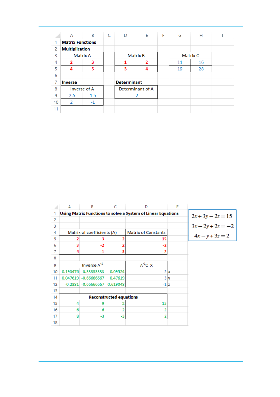 7. Create a worksheet to solve the following system of equations using matrix algebra: pg. 16 EXCEL FOR ENGINEERS