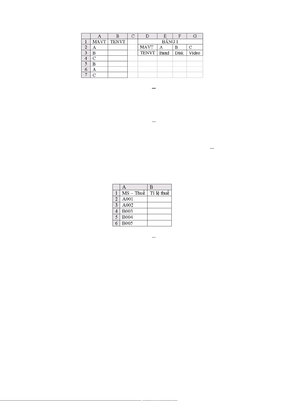 hỏi ny, để điền cột TENVT, tại ô B2, ta sử dụng công thc no sau đây? A. HLOKUP(A2,$E$2:$G$3,1,2) B. HLOOKUP(A2,$D$2:$G$3,2,0) C. HLOKUP(A1,$E$2:$G$3,2,1) D. HLOOKUP(A2,$E$2:$G$3,0,2) Câu 8.