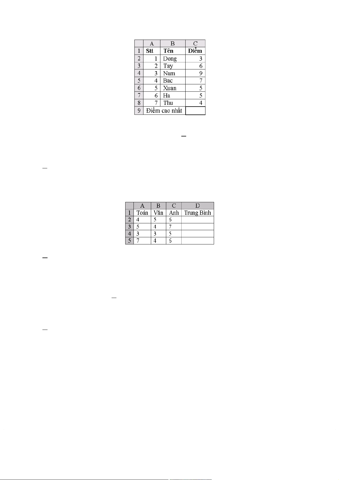 Câu 11. Trong Microsoft Excel, với b2ng dữ liệu như hình v., để tính điểm cao