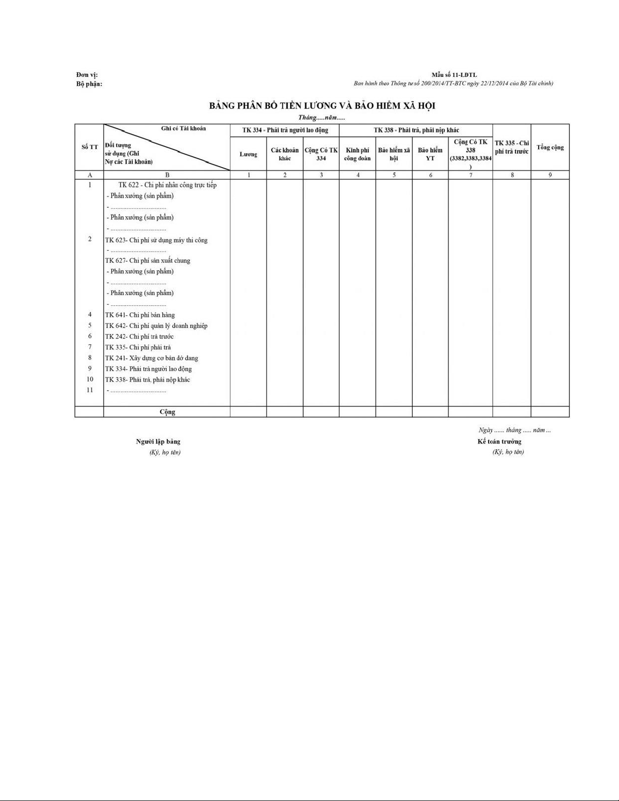 - Bảng phân bổ tiền lương và bảo hiểm xã hội
