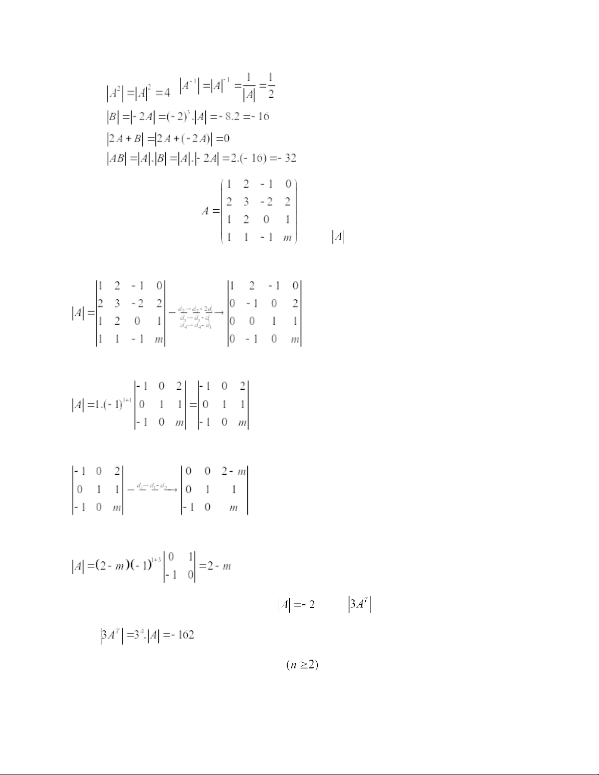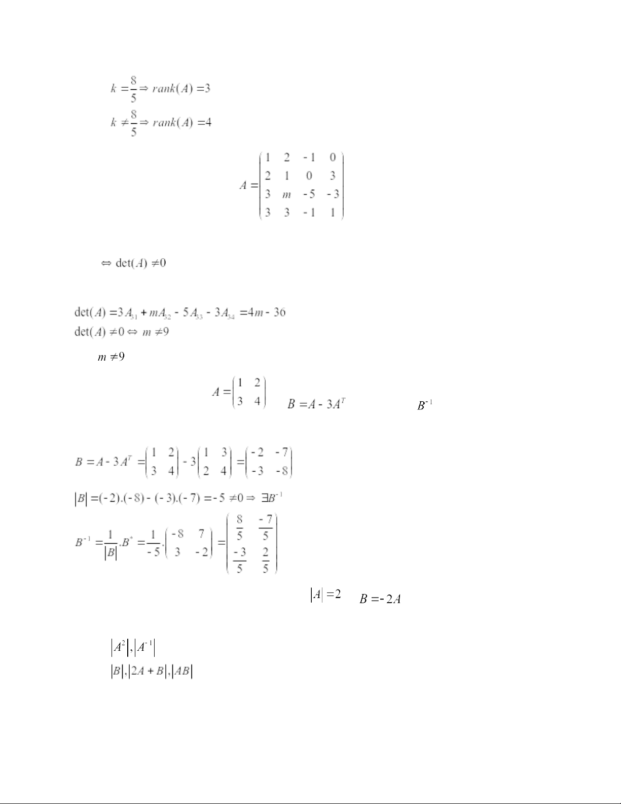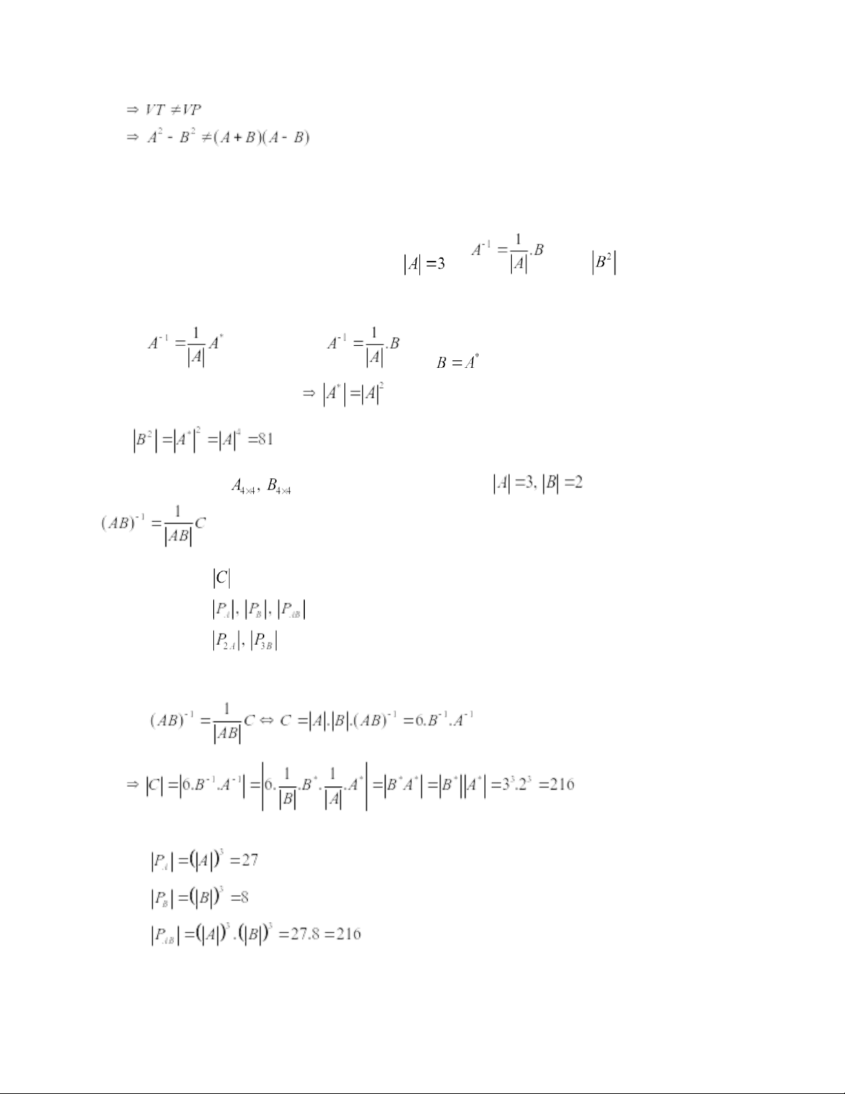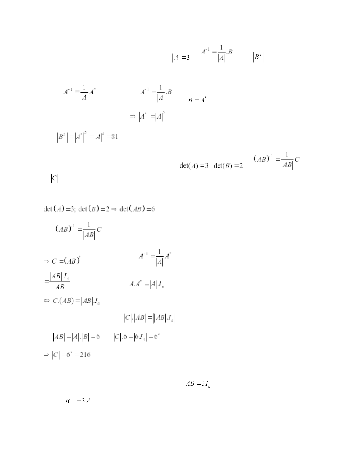 Câu 7: Cho A, B là các ma trận vuông cấp 4 có , và . Khi đó là: A. 36 B. 1296 C. 216 D. Tất cả đều sai. Giải: Có: (dựa vào công thức ) (dựa vào công thức )