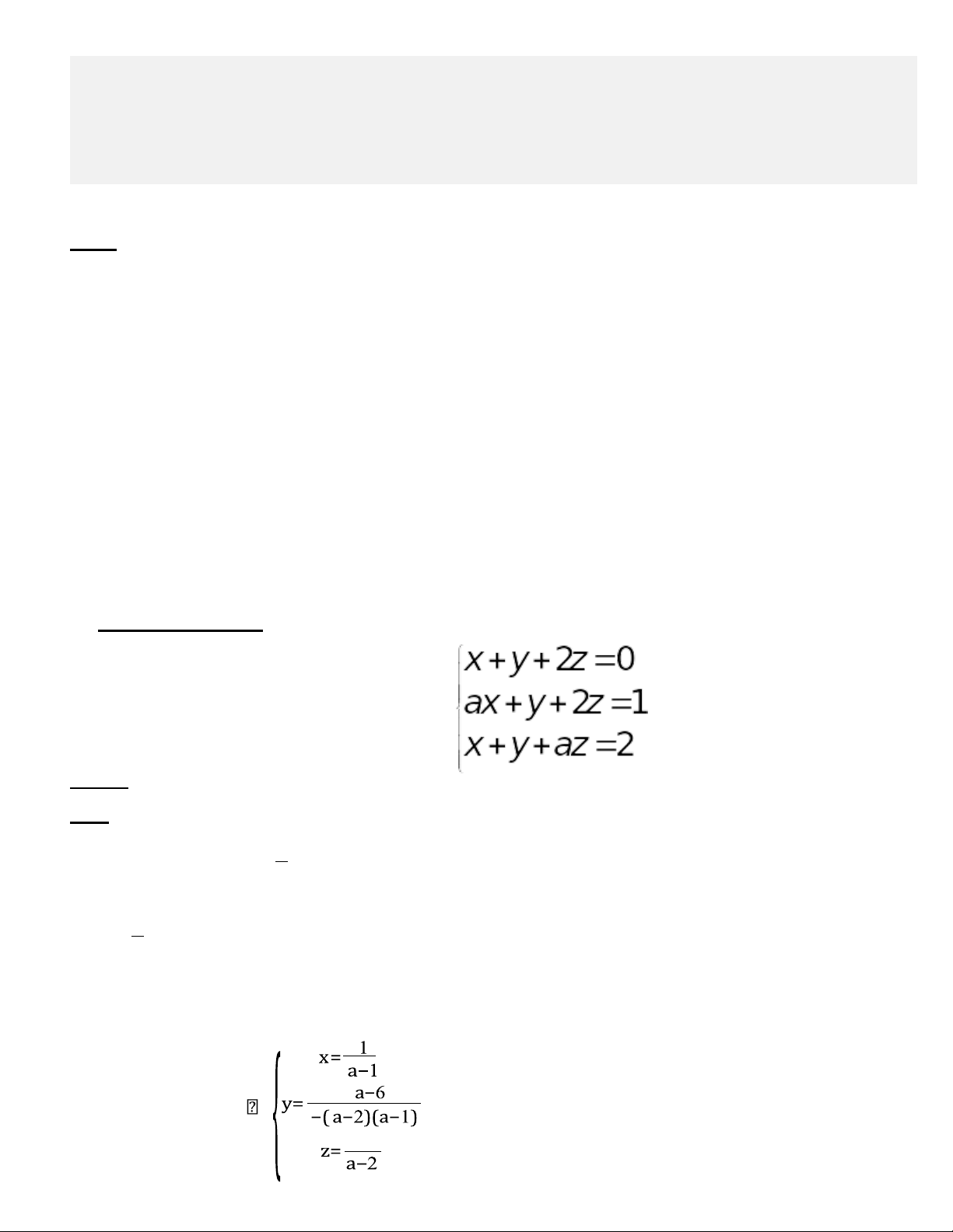 a≠ 1 ,a≠ 2 , hệ có nghiệm duy nhất x = ; y= 5 a−6 ; z= 2 . a−1 −( a− 2) (a−1) a−2 a = 1 thì hệ vô nghiệm. a = 2 thì hệ vô nghiệm.