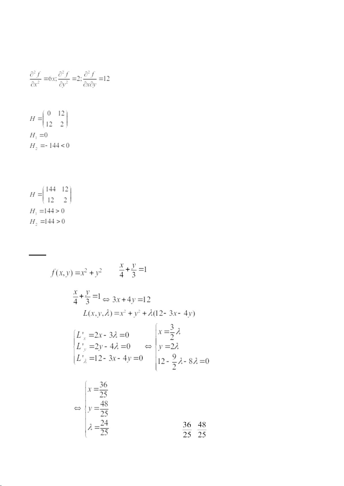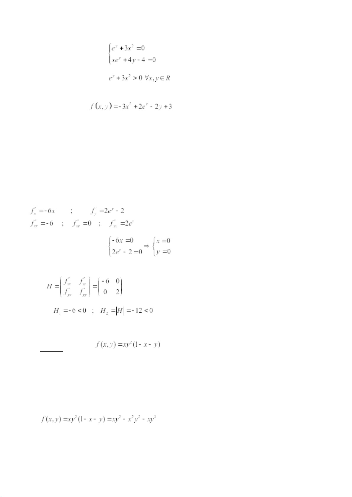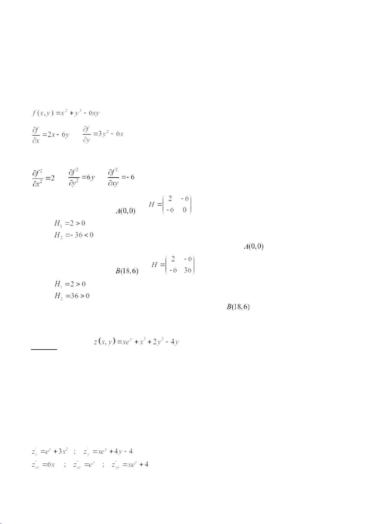 *Tại M1(0,0), ma trận Hesse H=( 2 −6) −6 0 H =2>0 Ta có: 1 { H 2=∣H∣=−36∈0