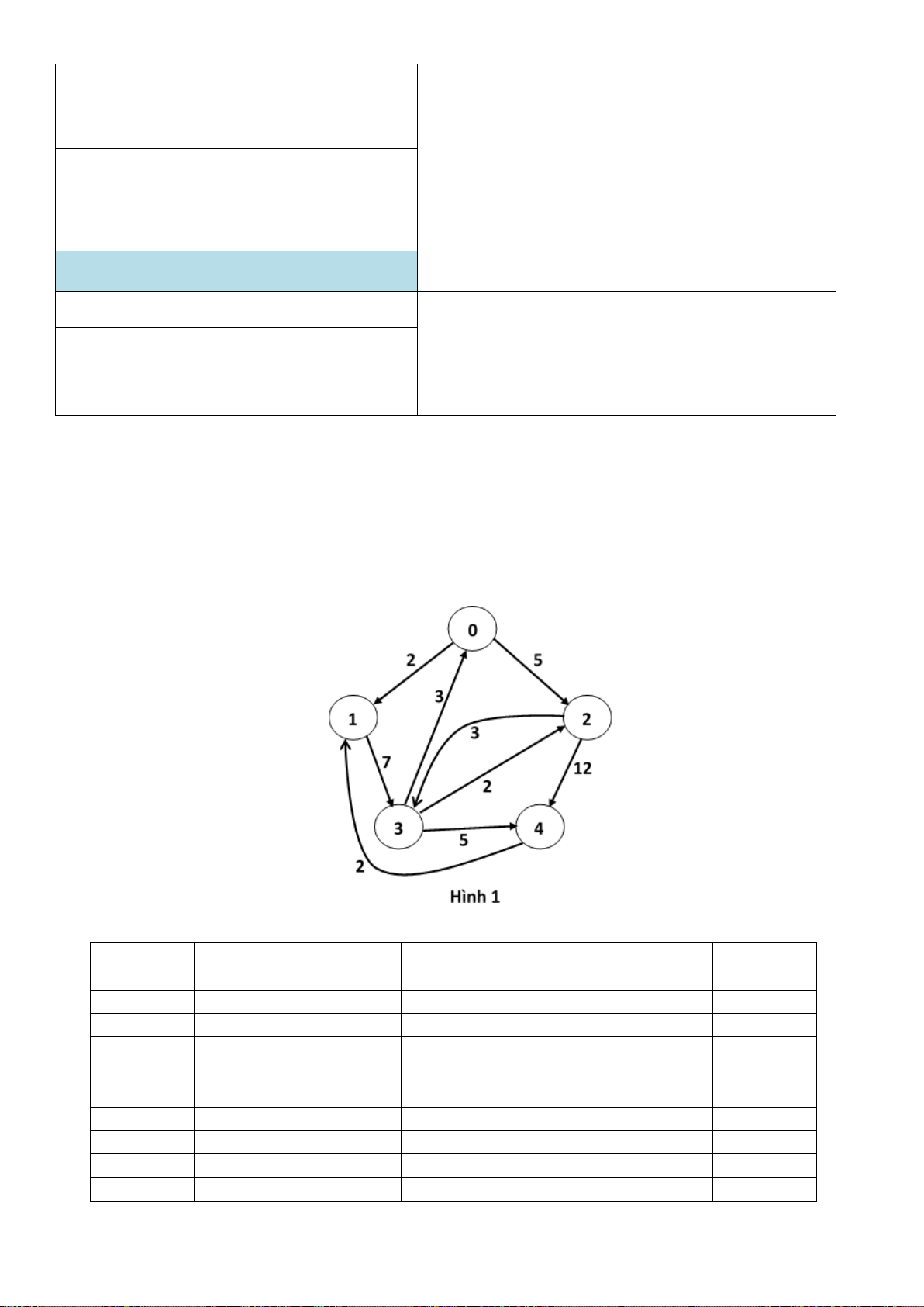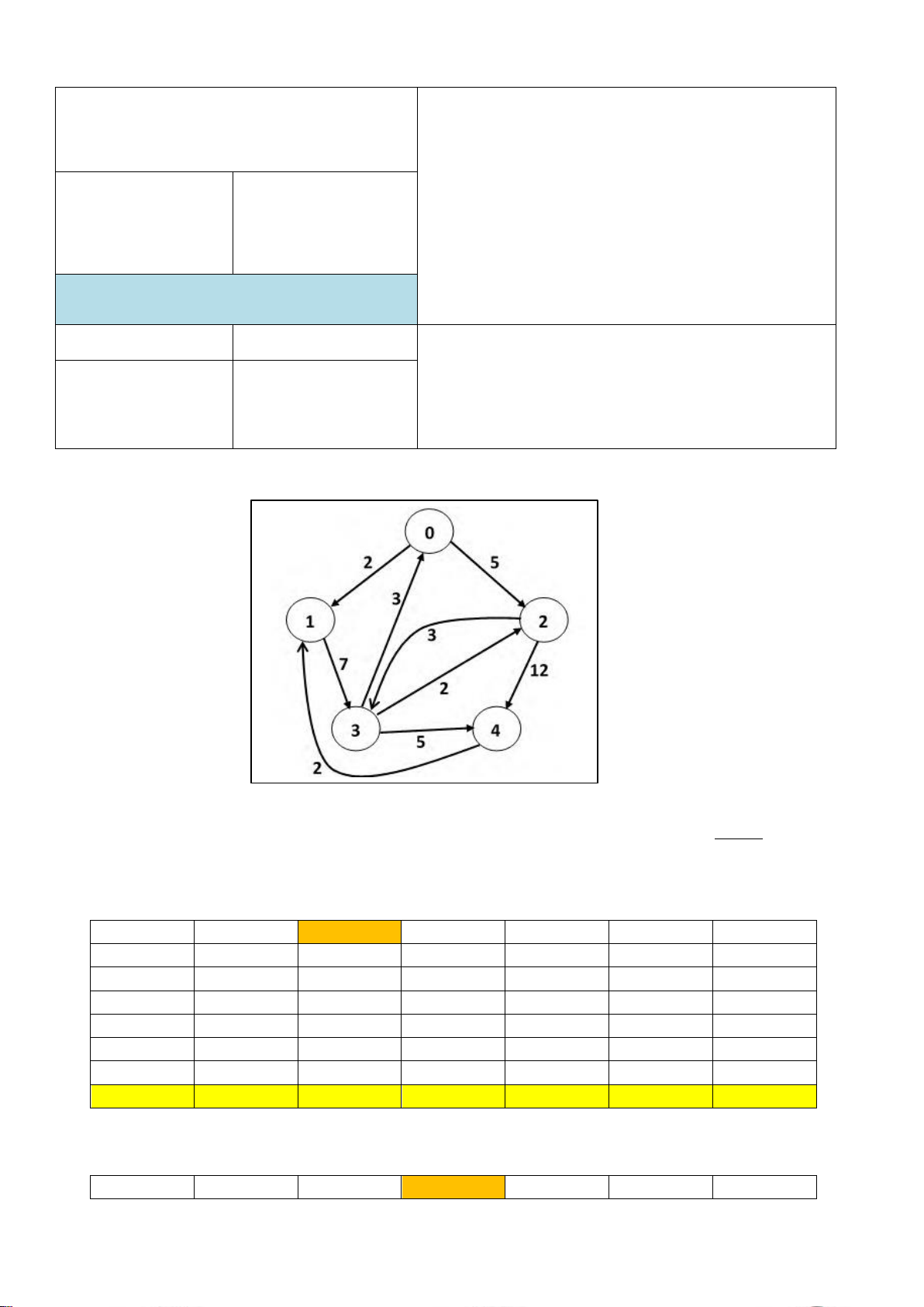 Dijkstra tìm đường đi ngắn nhất từ S đến các đỉnh trong đồ thị, với S = STT % 3 = (Sinh viên phải viết rõ). S = 0 : VH = vô hạn i u 0 1 2 3 4 0 0, −1 VH, VH, VH, VH, 1 0 2, 0 5, 0 2 1 9, 1 3 2 8, 2 17, 2 4 3 13, 3 5 4 6 0, −1 2, 0 5, 0 8, 2 13, 3