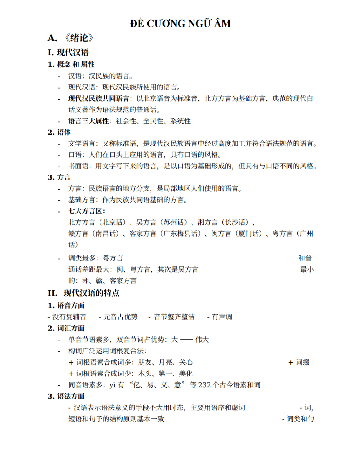 Đề cương Ngữ âm A - Tổng quan về hiện đại Hán ngữ và Ngữ âm môn Hán ngữ | Trường Đại học Hà Nội