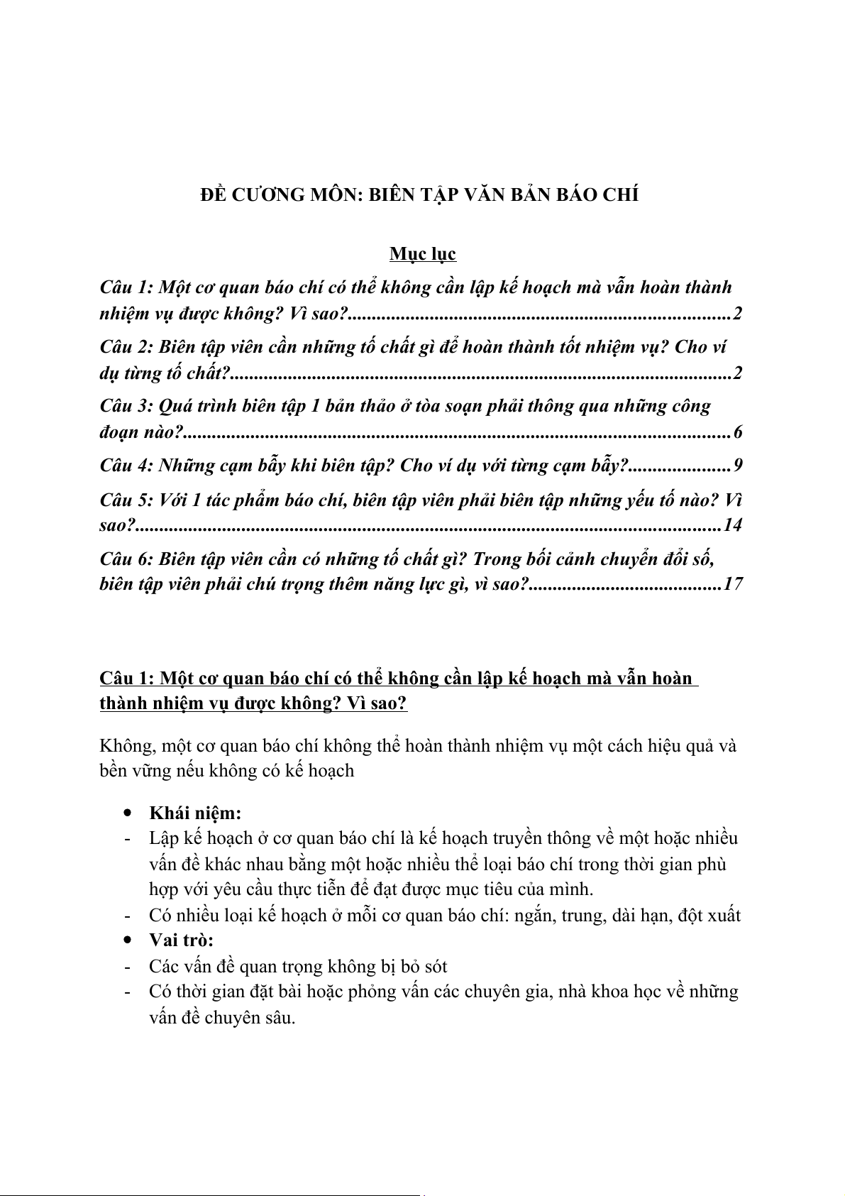ĐỀ CƯƠNG MÔN: BIÊN TẬP VĂN BẢN BÁO CHÍ Mục lục