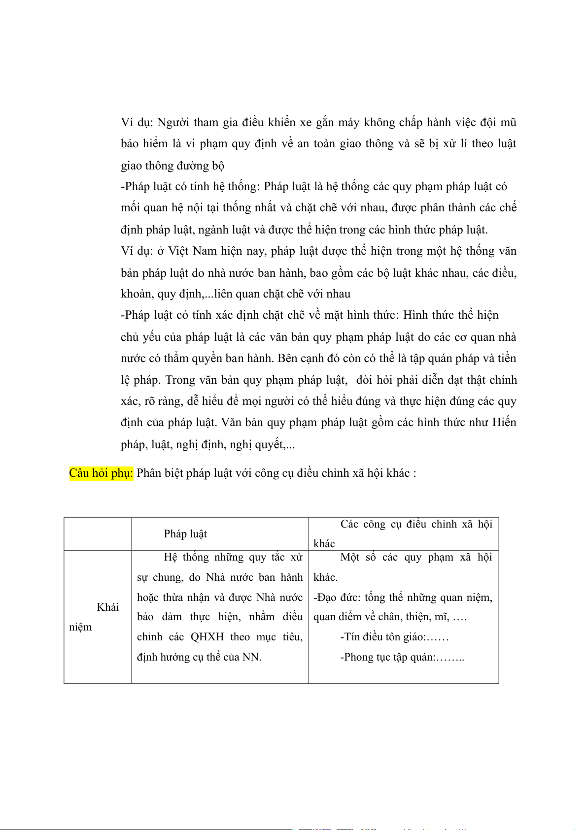Câu hỏi phụ: Phân biệt pháp luật với công cụ điều chỉnh xã hội khác :