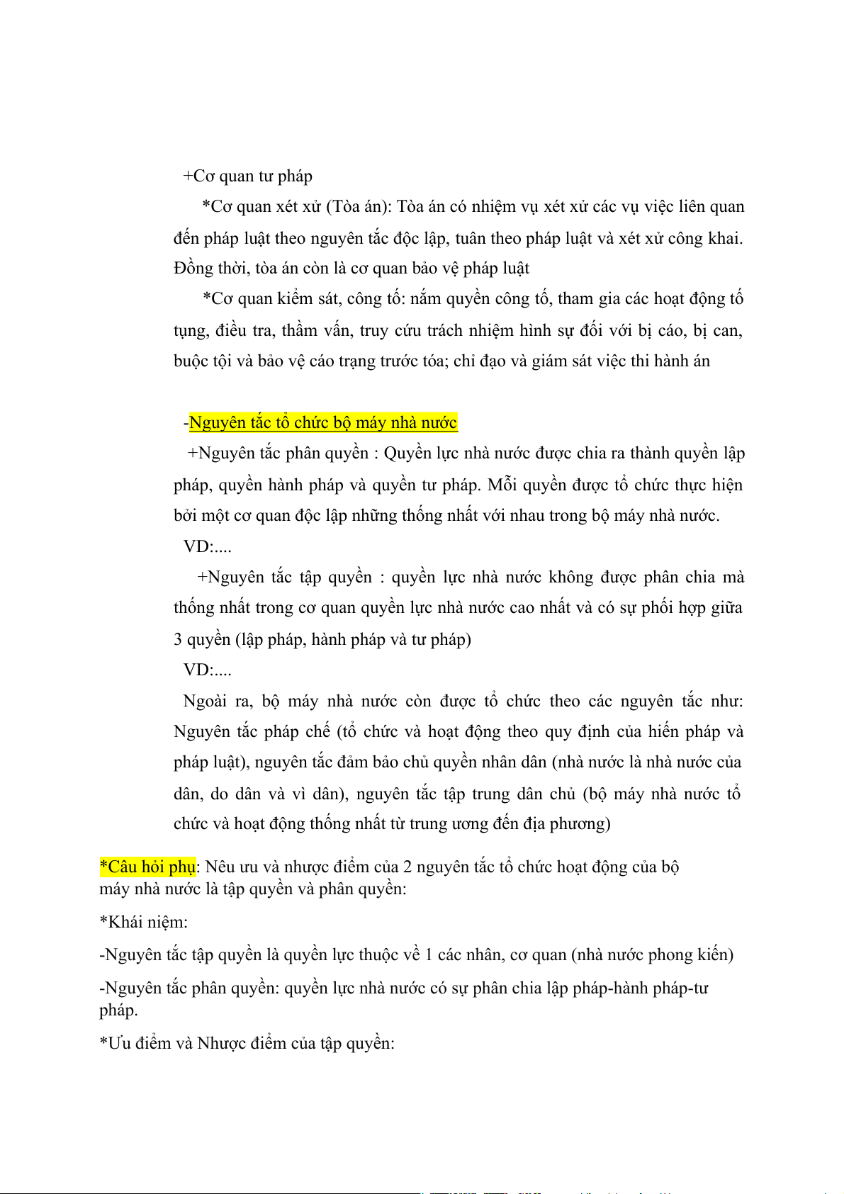 +Nguyên tắc tập quyền : quyền lực nhà nước không được phân chia mà