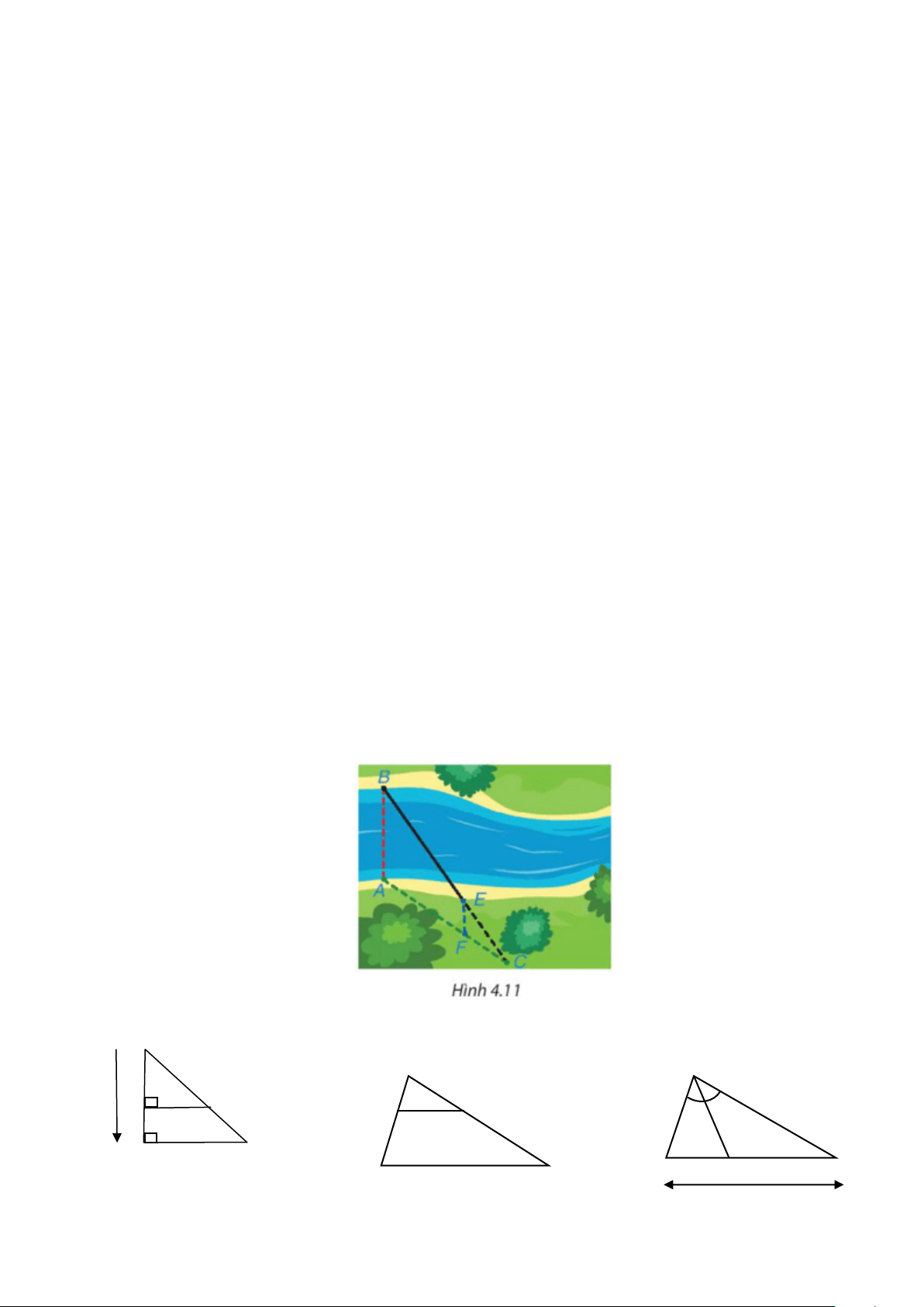 (H.4.11). Sau đó bác An đo được AF = 40 m, FC = 20 m, EC = 30 m. Hỏi khoảng cách giữa hai vị trí B và E bằng bao nhiêu?