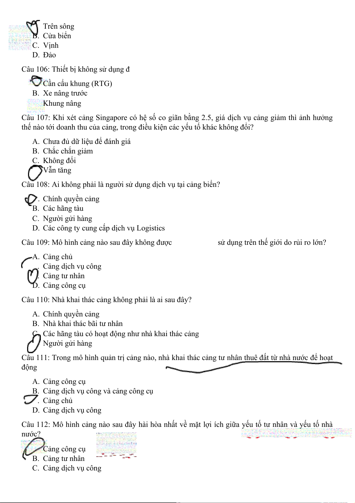 Câu 112: Mô hình cảng nào sau đây hài hòa nhất về mặt lợi ích giữa yếu tố tư nhân và yếu tố nhà nước? Cảng công cụ B. Cảng tư nhân C. Cảng dịch vụ công Cảng chủ