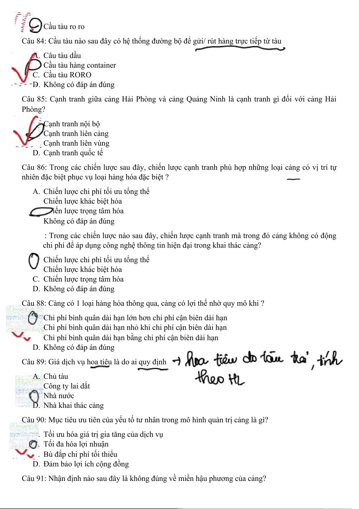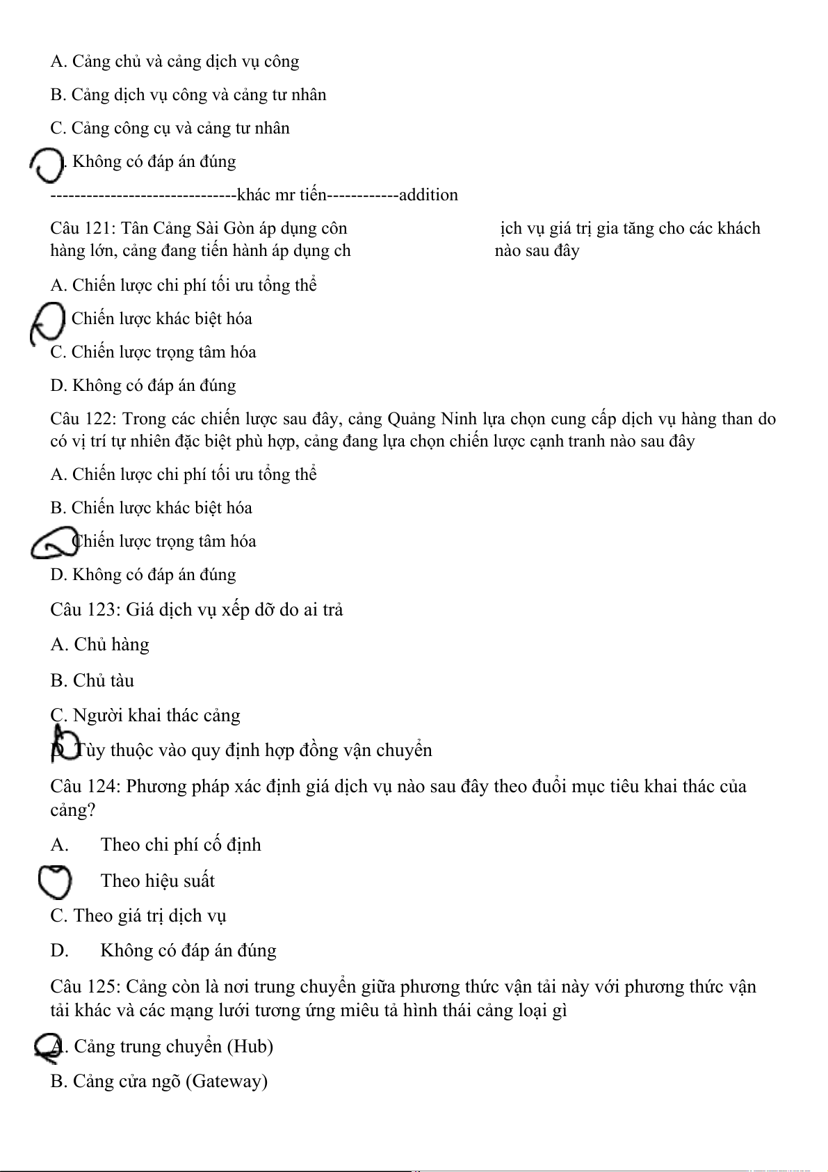 Câu 123: Giá dịch vụ xếp dỡ do ai trả A. Chủ hàng B. Chủ tàu C. Người khai thác cảng