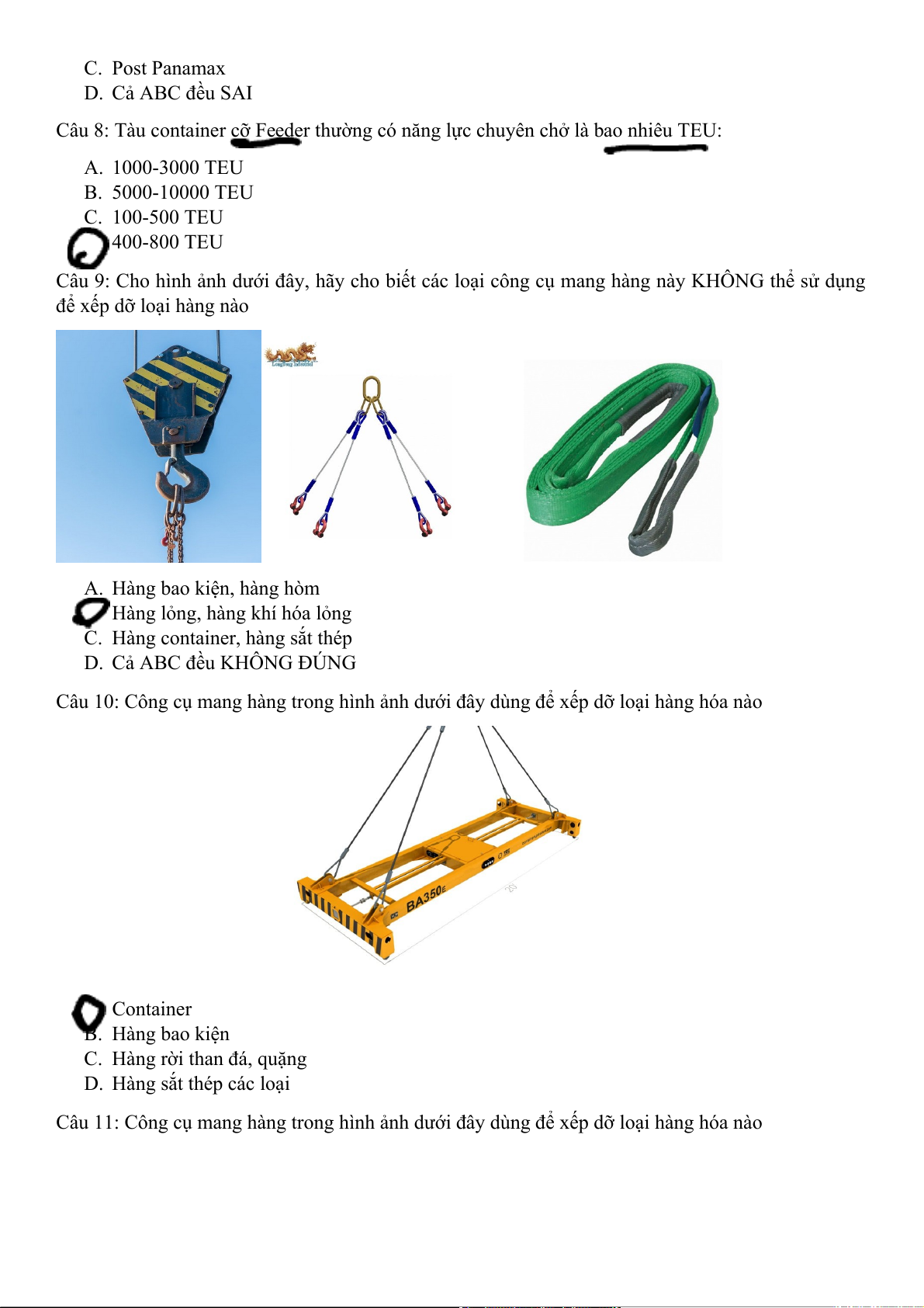 Câu 8: Tàu container cỡ Feeder thường có năng lực chuyên chở là bao nhiêu TEU: A. 1000-3000 TEU B. 5000-10000 TEU C. 100-500 TEU 400-800 TEU