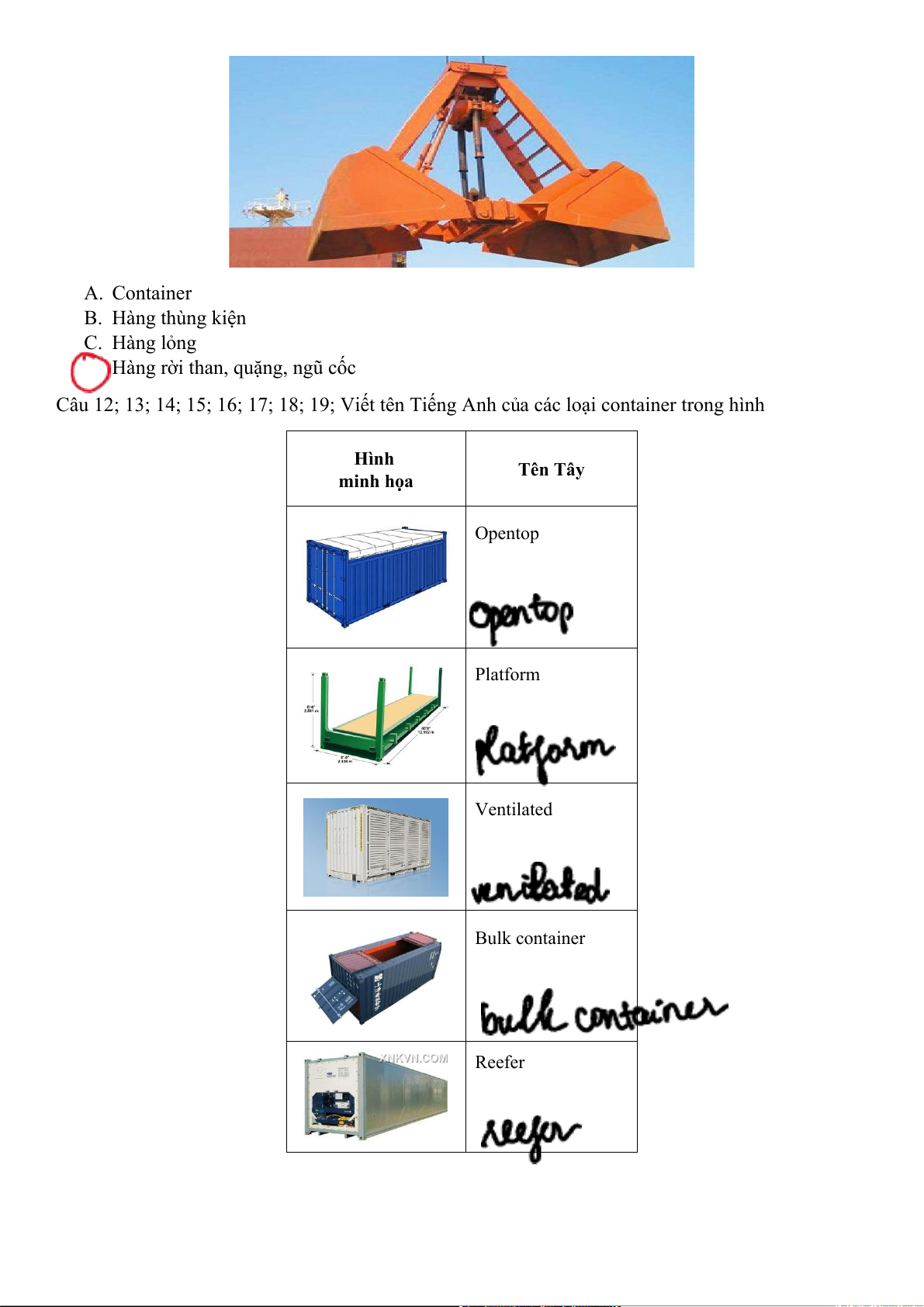 Câu 12; 13; 14; 15; 16; 17; 18; 19; Viết tên Tiếng Anh của các loại container trong hình Hình Tên Tây minh họa Opentop Platform Ventilated Bulk container Reefer Tank Open side Half Height