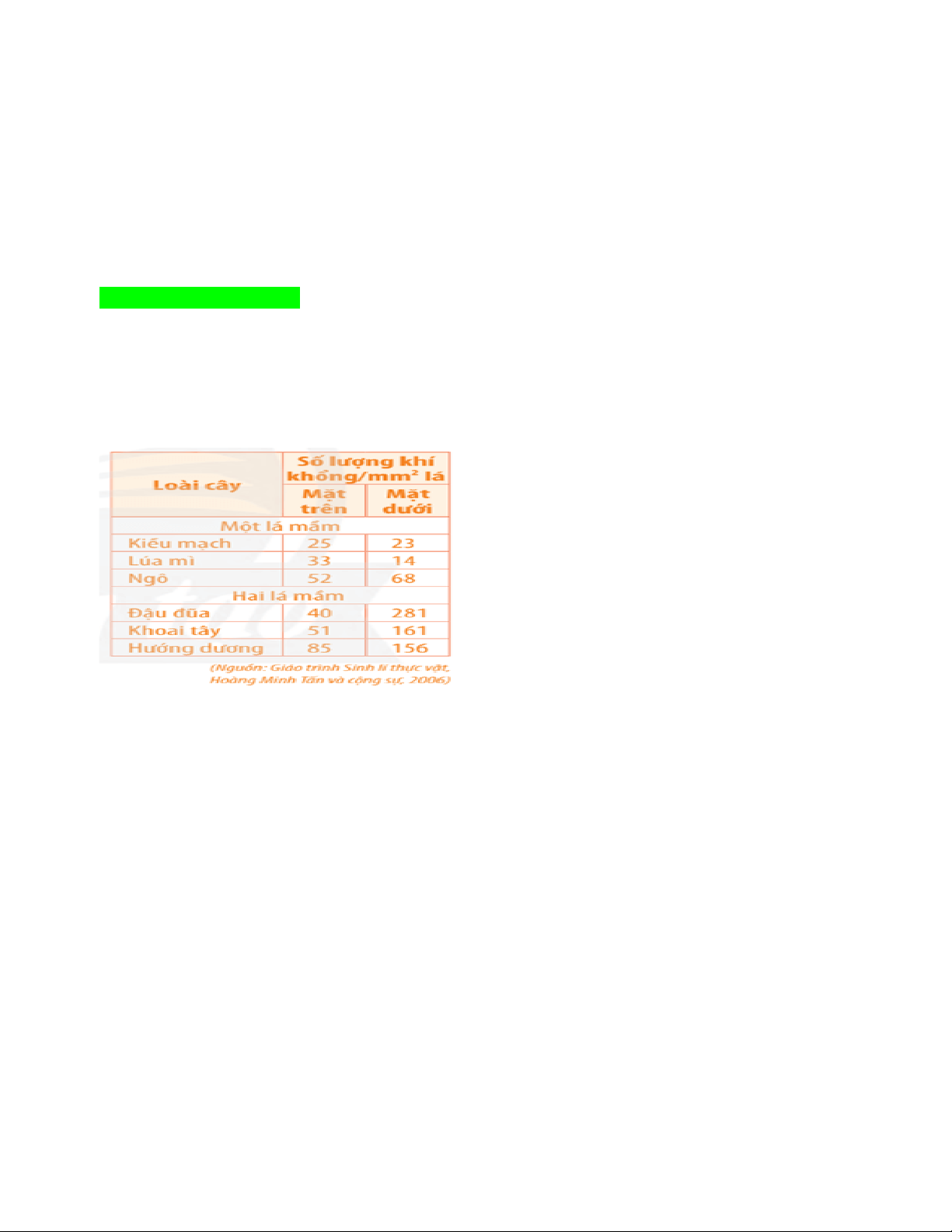 Câu 2: Quan sát bảng số liệu về số lượng khí khổng ở hai mặt lá của các loài thực vật bên dưới.
