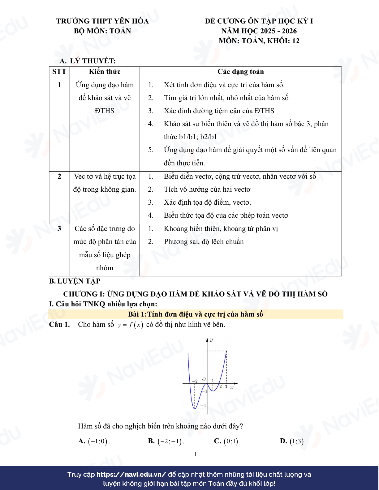 ĐỀ CƯƠNG ÔN TẬP HỌC KỲ I BỘ MÔN: TOÁN NĂM HỌC 2025 - 2026 MÔN: TOÁN, KHỐI: 12 A. LÝ THUYẾT: STT Kiến thức Các dạng toán 1 Ứng dụng đạo hàm