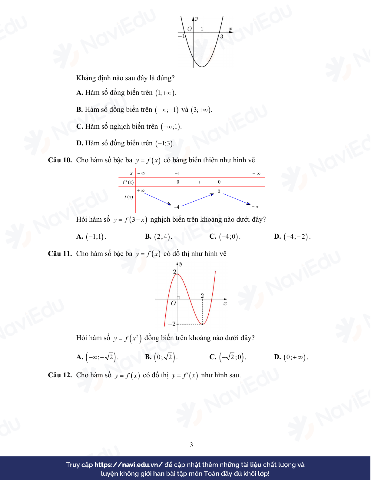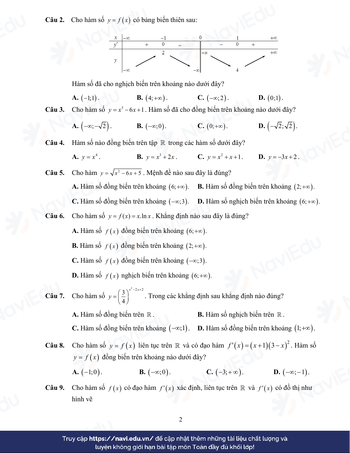 Câu 4. Hàm số nào đồng biến trên tập trong các hàm số dưới đây? A. 4 y x . B. 3 y x 2x . C. 2 y x x 1. D. y 3 x 2 . Câu 5. Cho hàm 2