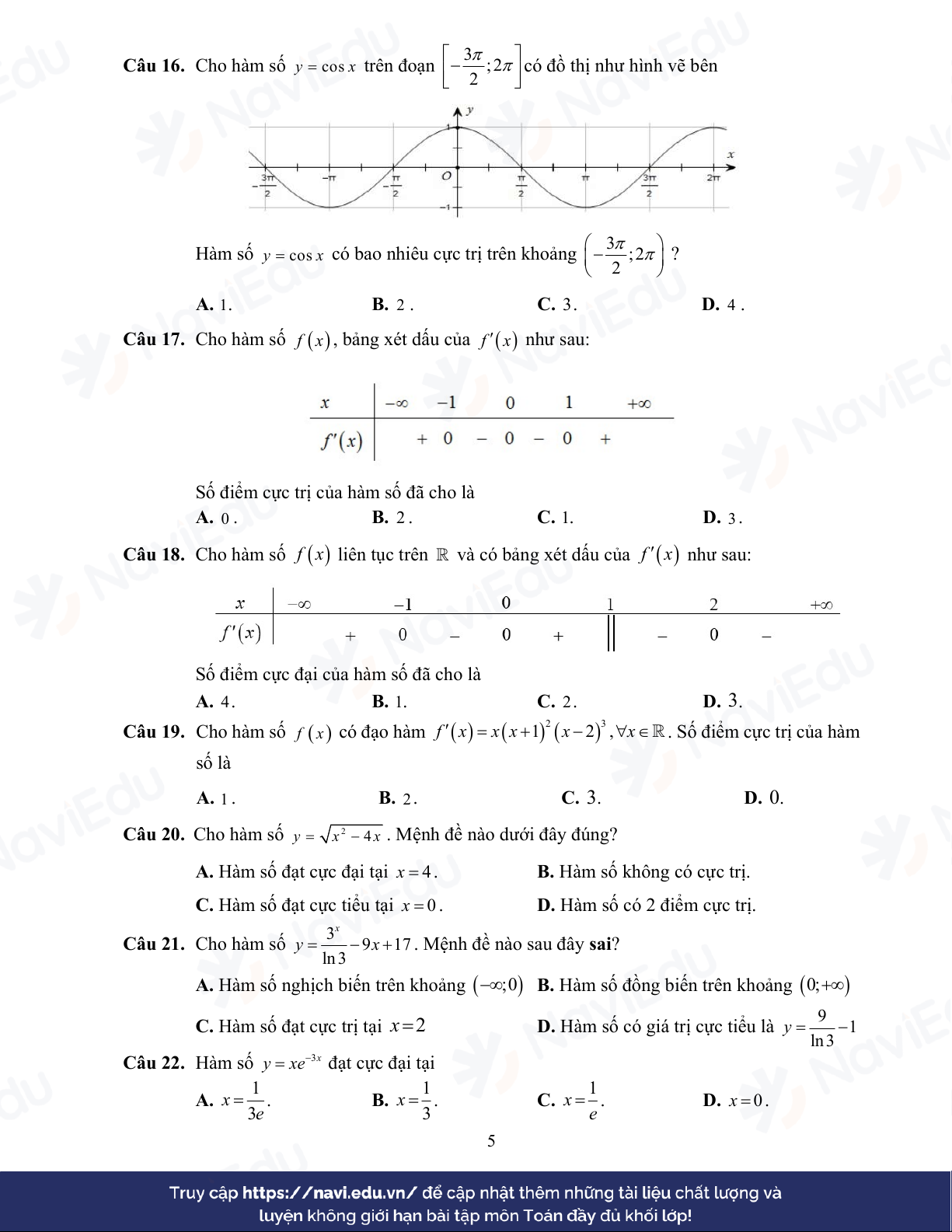 D. Hàm số có giá trị cực tiểu là y 1 ln 3 Câu 22. Hàm số 3x y xe đạt cực đại tại 1 1 1 A. x . B. x . C. x . D. x 0 . 3e 3 e 5