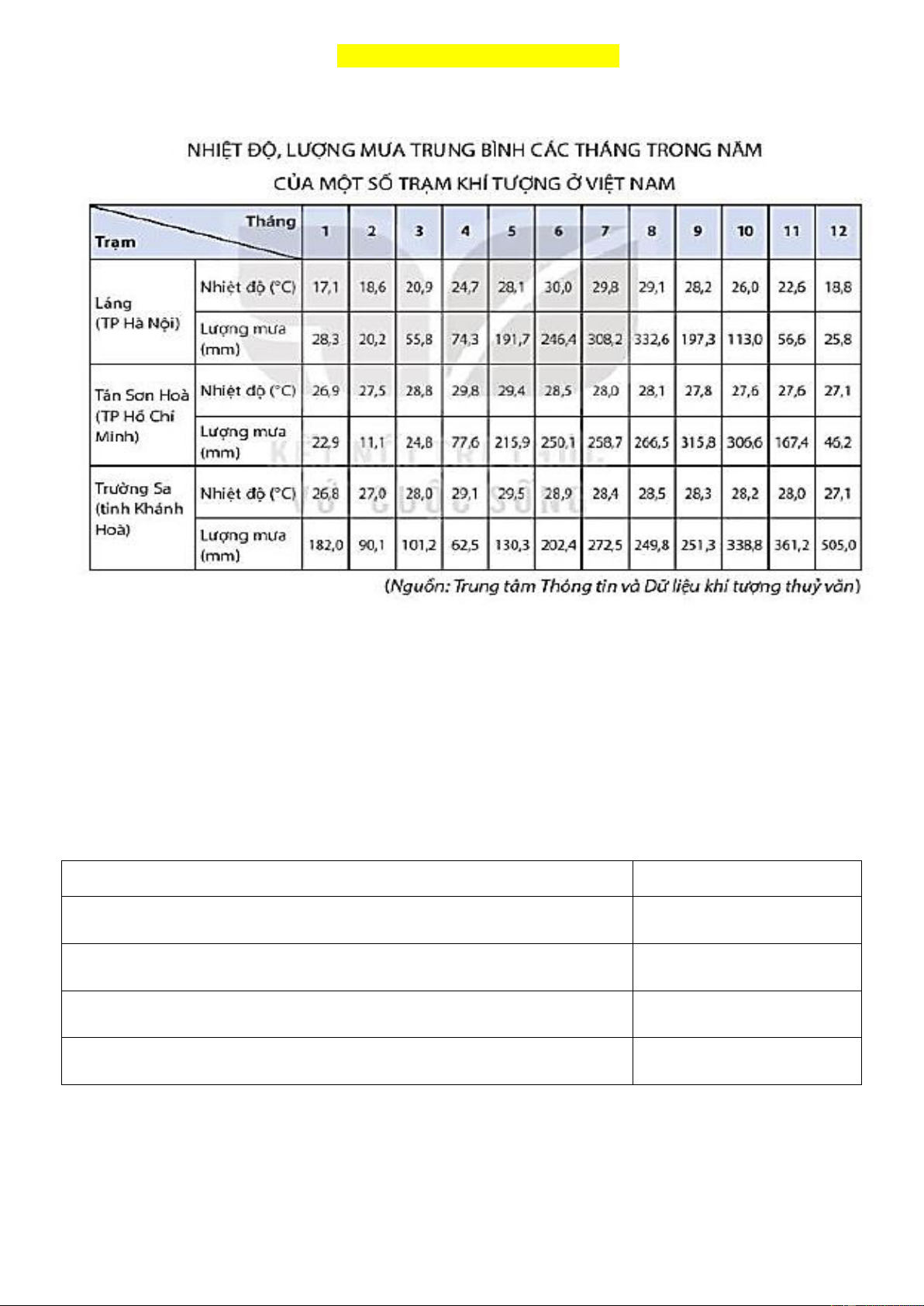 - Cho biết thời gian mùa mưa (mùa mưa là thời gian có 3 tháng liên tục trở lên có lượng mưa trên 100mm)